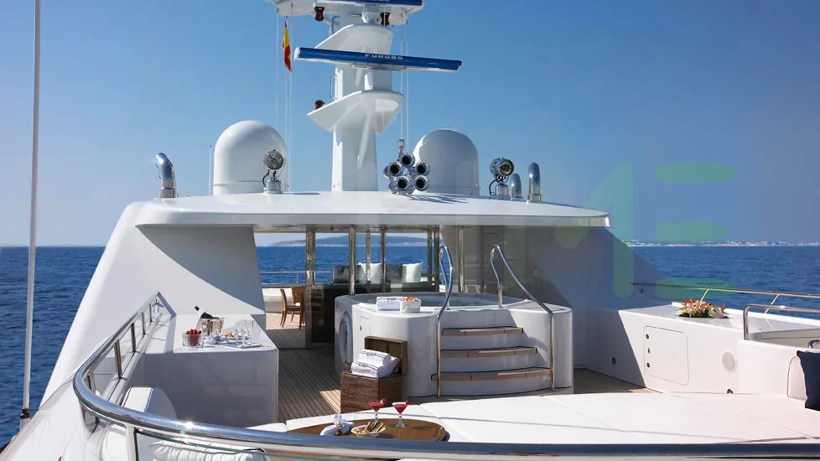 Her features include separate crew passageway, deck jacuzzi, WiFi and air conditioning.