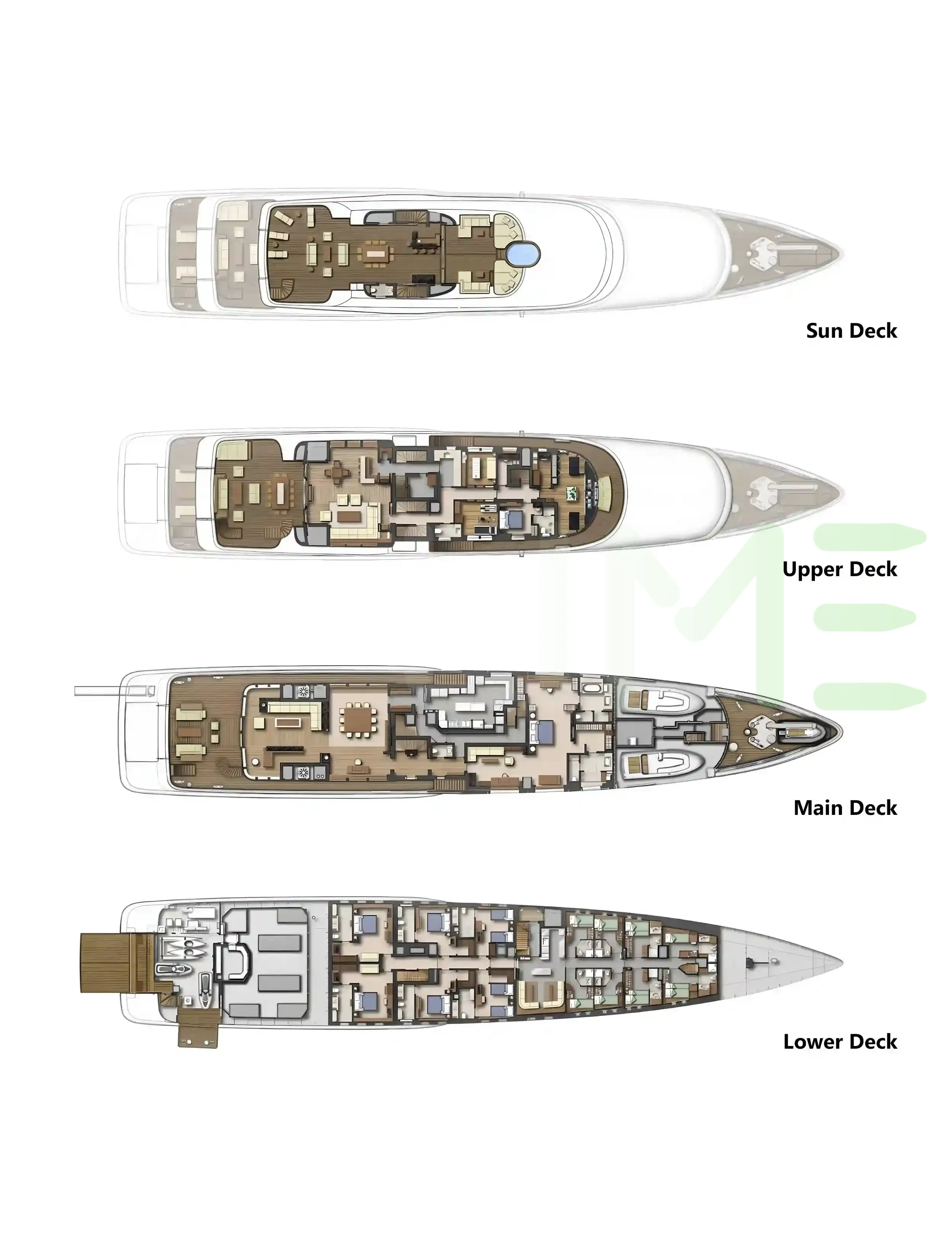 Request plans that include the layout of staterooms, guest areas, and outdoor spaces, as well as crew quarters and work areas.