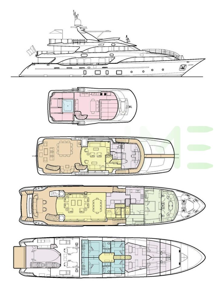 Request plans that include the layout of staterooms, guest areas, and outdoor spaces, as well as crew quarters and work areas.
