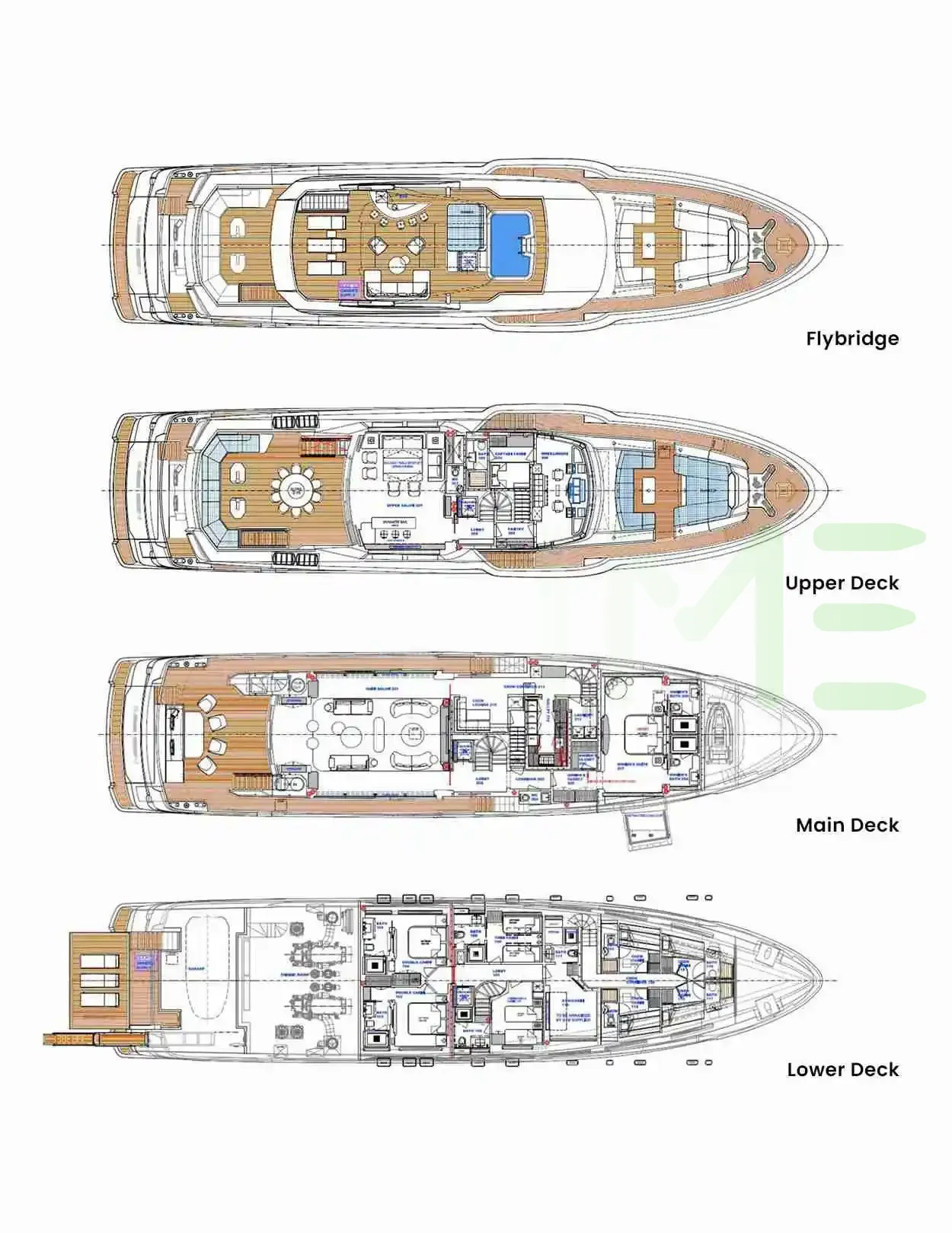 Request plans that include the layout of staterooms, guest areas, and outdoor spaces, as well as crew quarters and work areas.