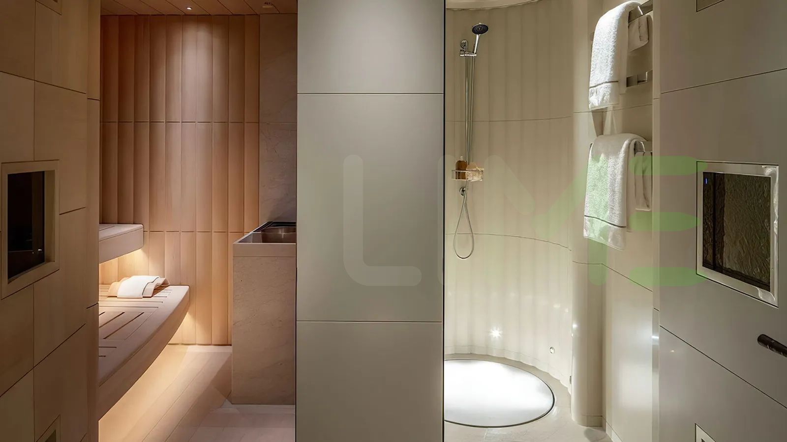 Her features include separate crew passageway, spa, beauty salon, elevator, underwater lights, beach club, gym and air conditioning.