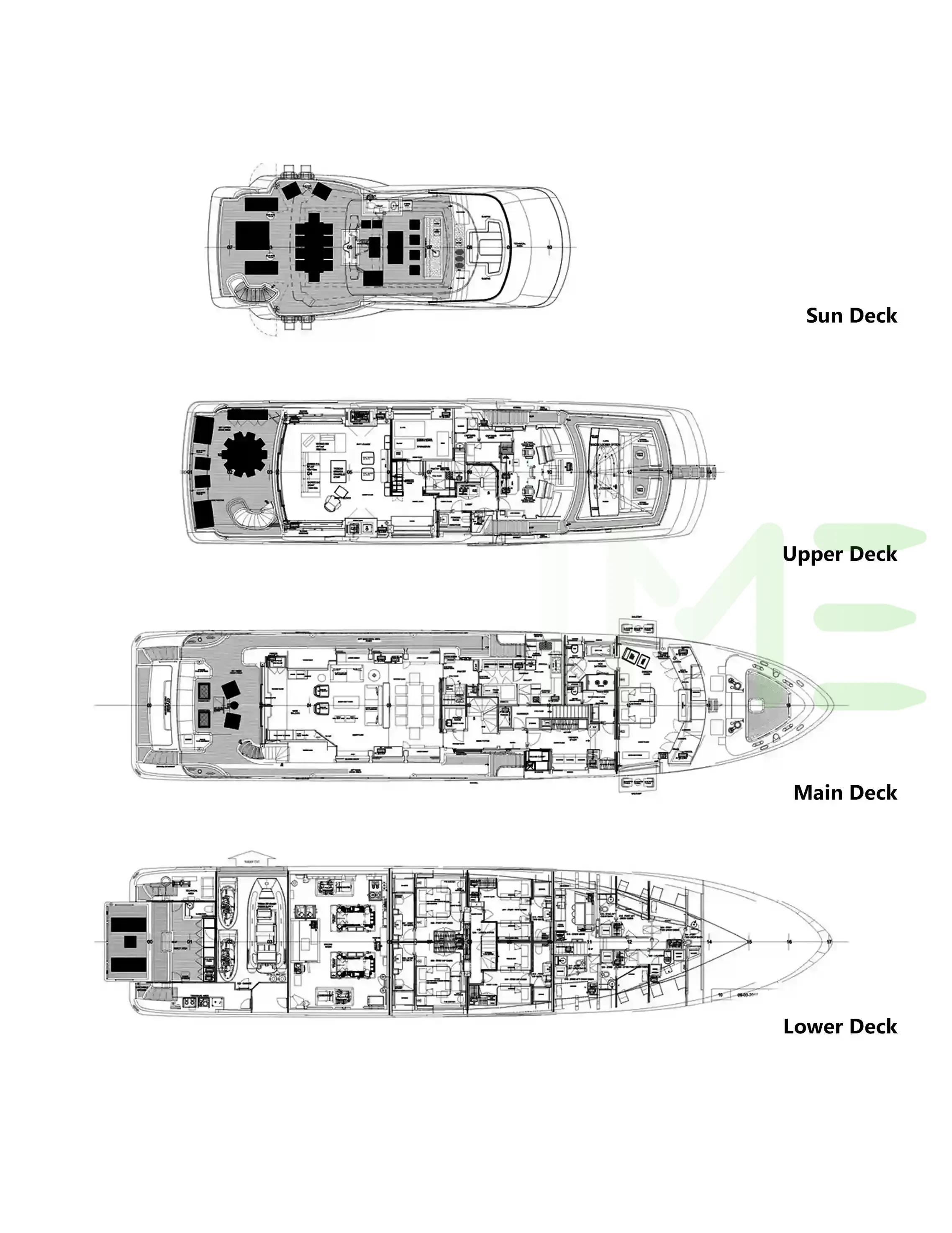 Request plans that include the layout of staterooms, guest areas, and outdoor spaces, as well as crew quarters and work areas.