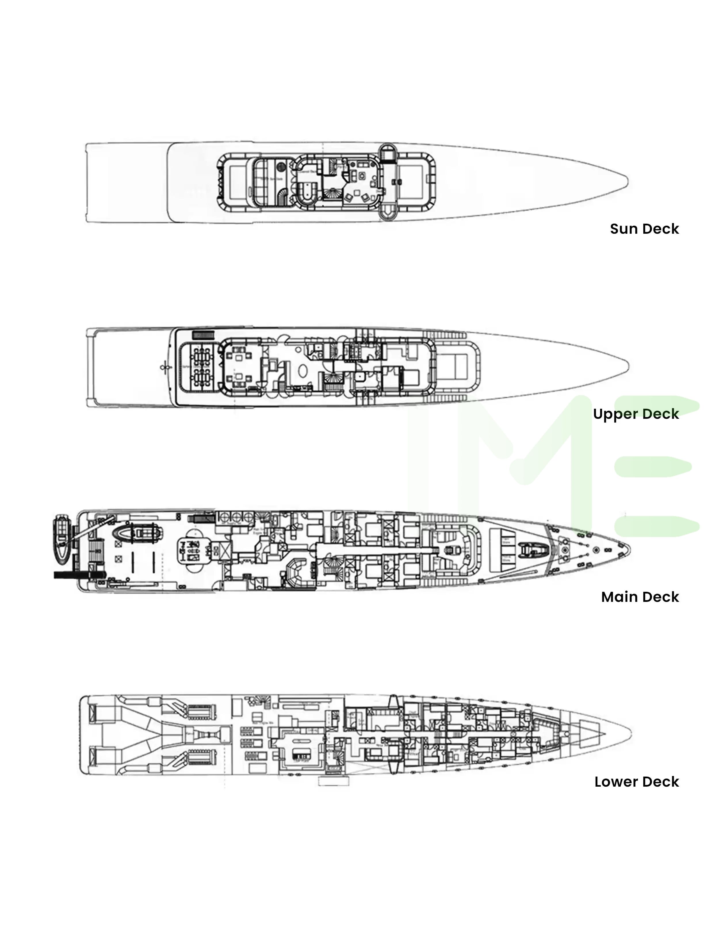 Request plans that include the layout of staterooms, guest areas, and outdoor spaces, as well as crew quarters and work areas.