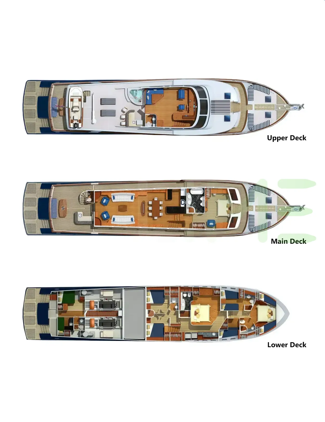Request plans that include the layout of staterooms, guest areas, and outdoor spaces, as well as crew quarters and work areas.