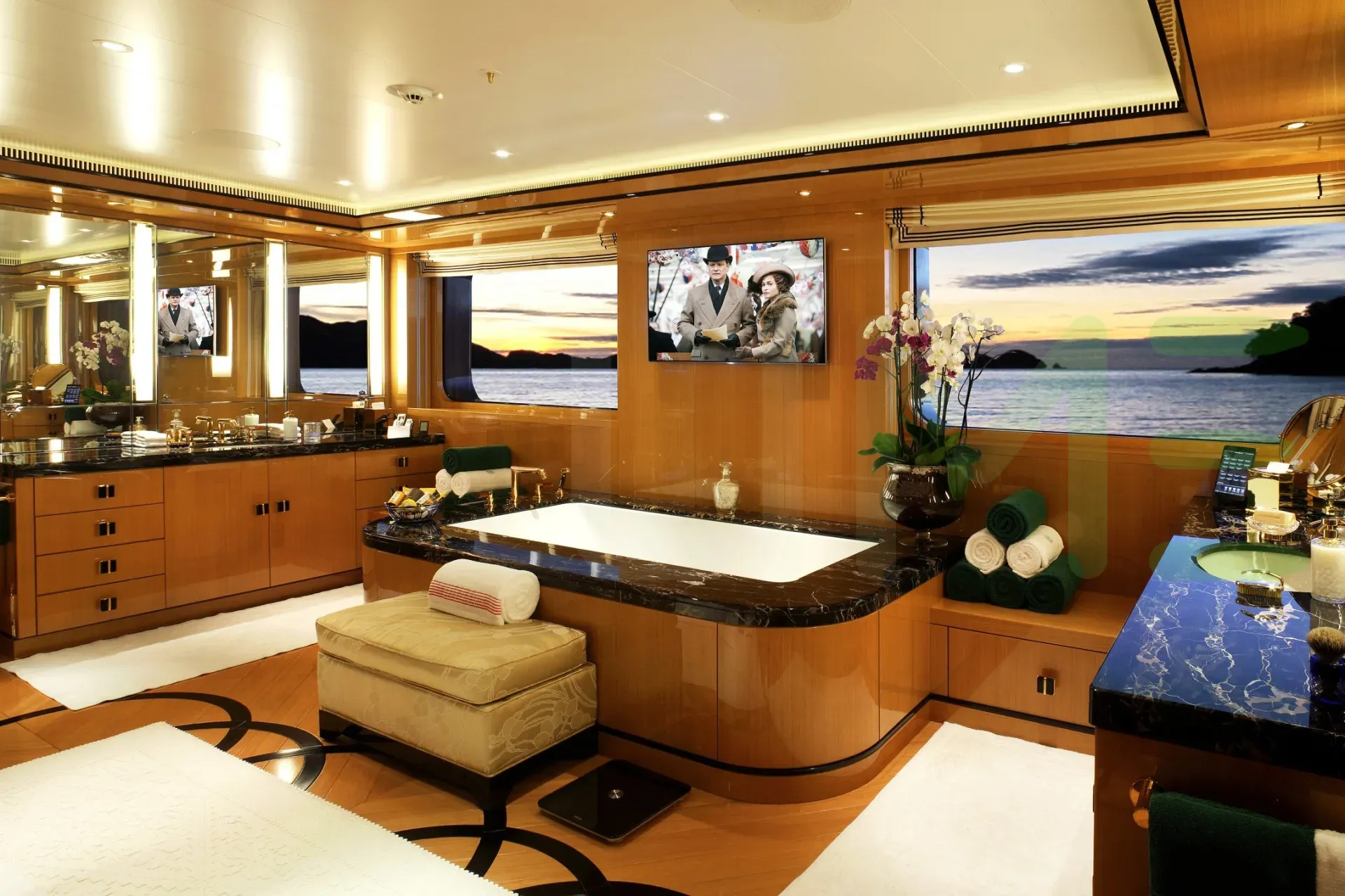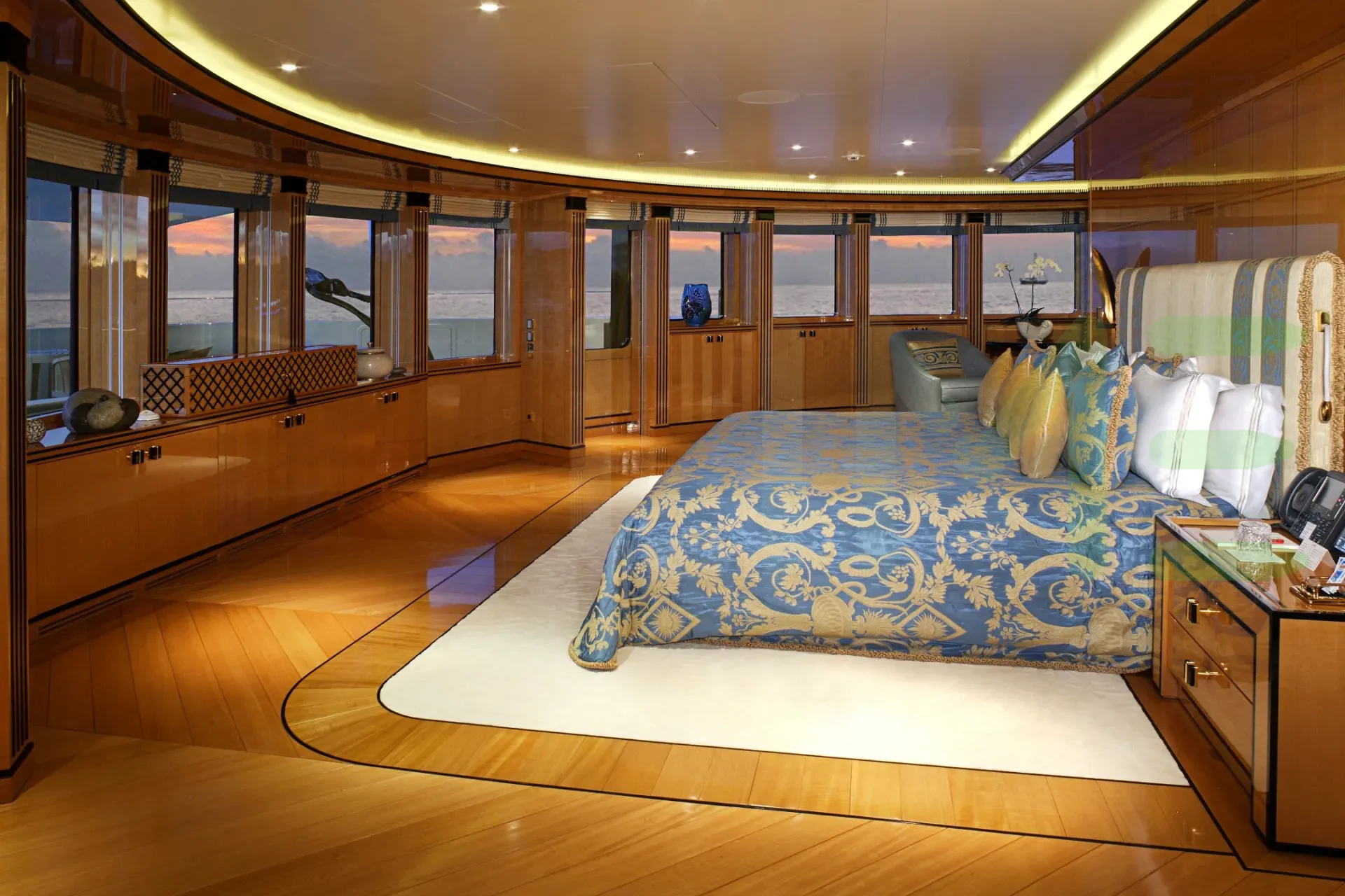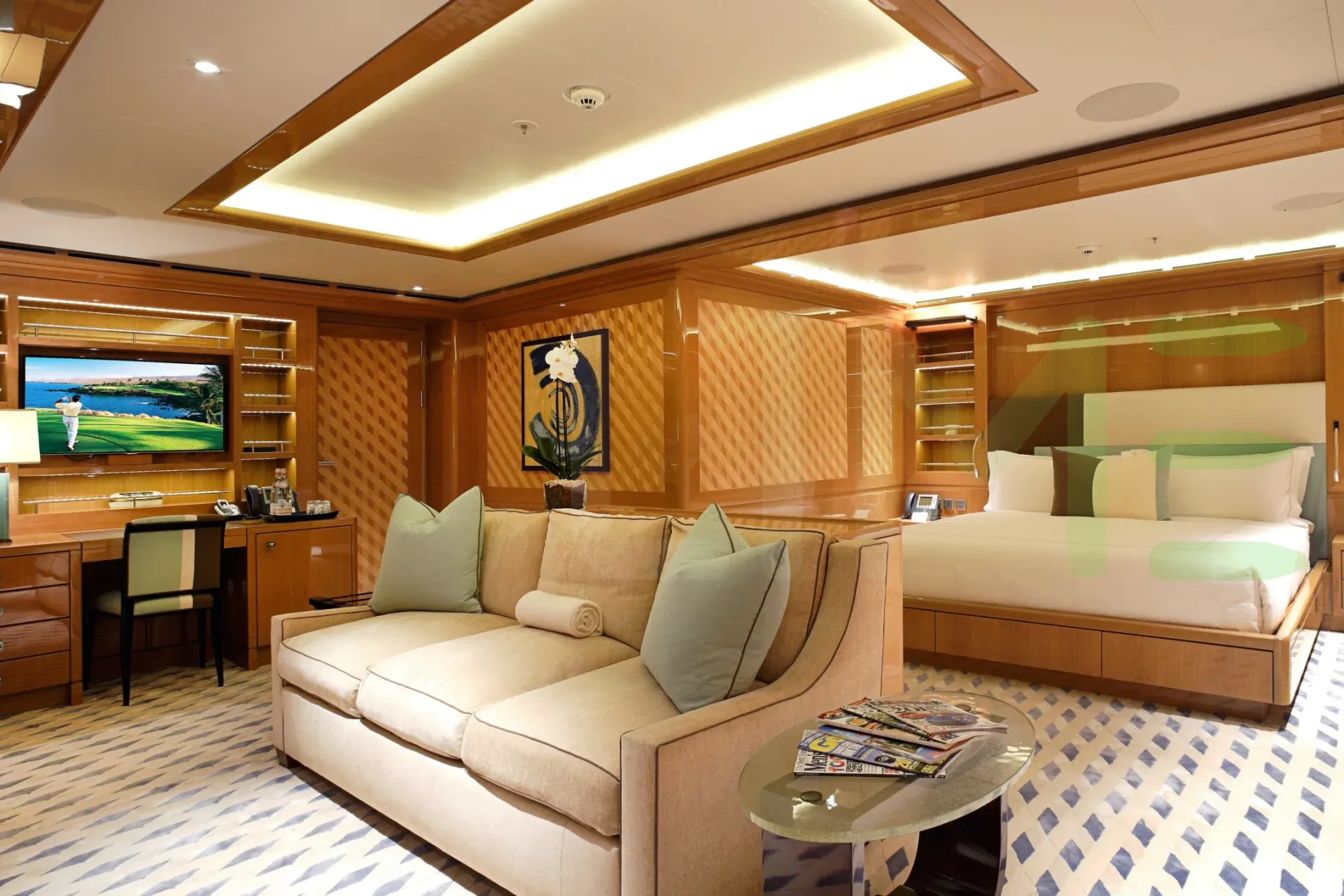 Her features include beauty salon, elevator, underwater lights, beach club, gym and air conditioning.
