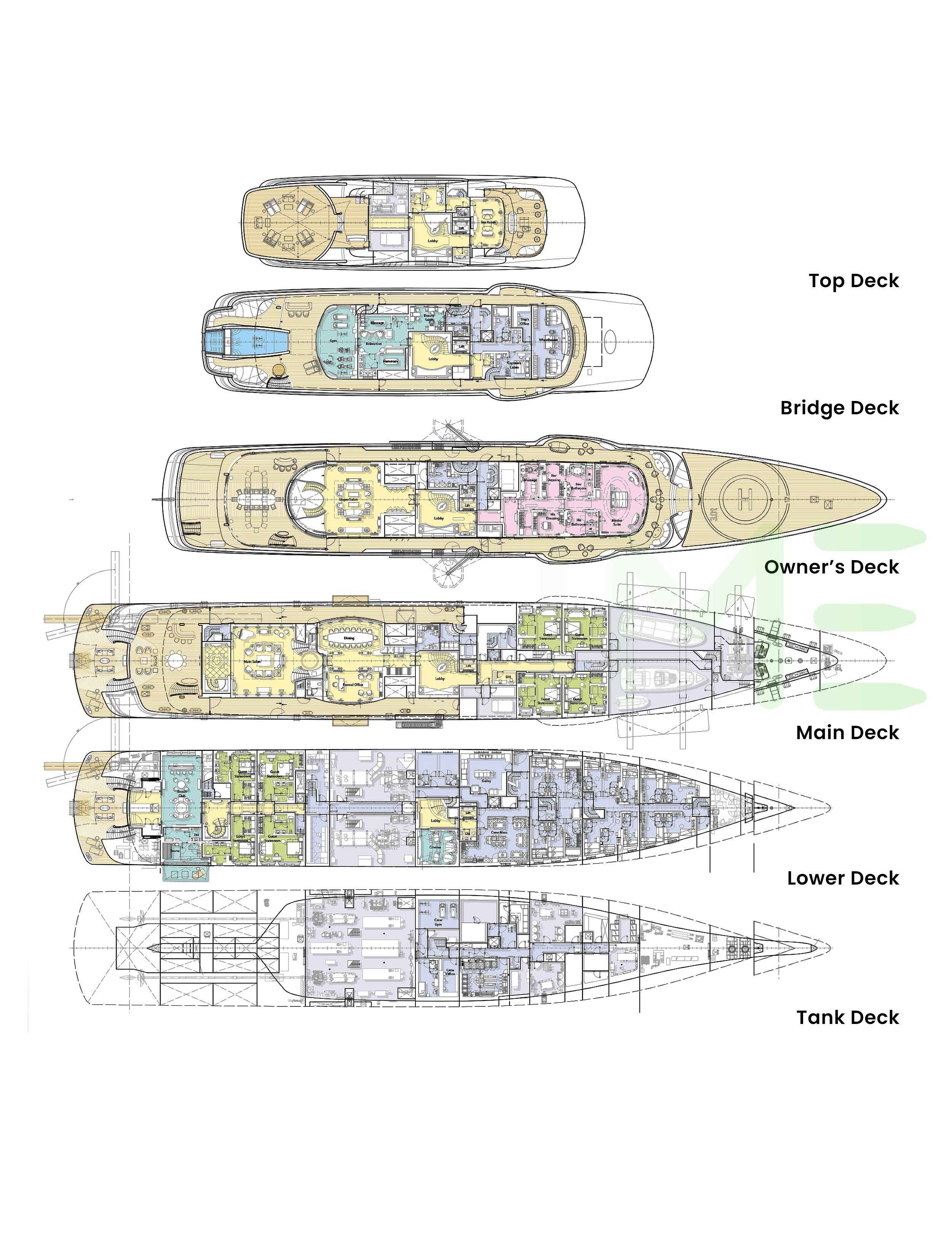Request plans that include the layout of staterooms, guest areas, and outdoor spaces, as well as crew quarters and work areas.