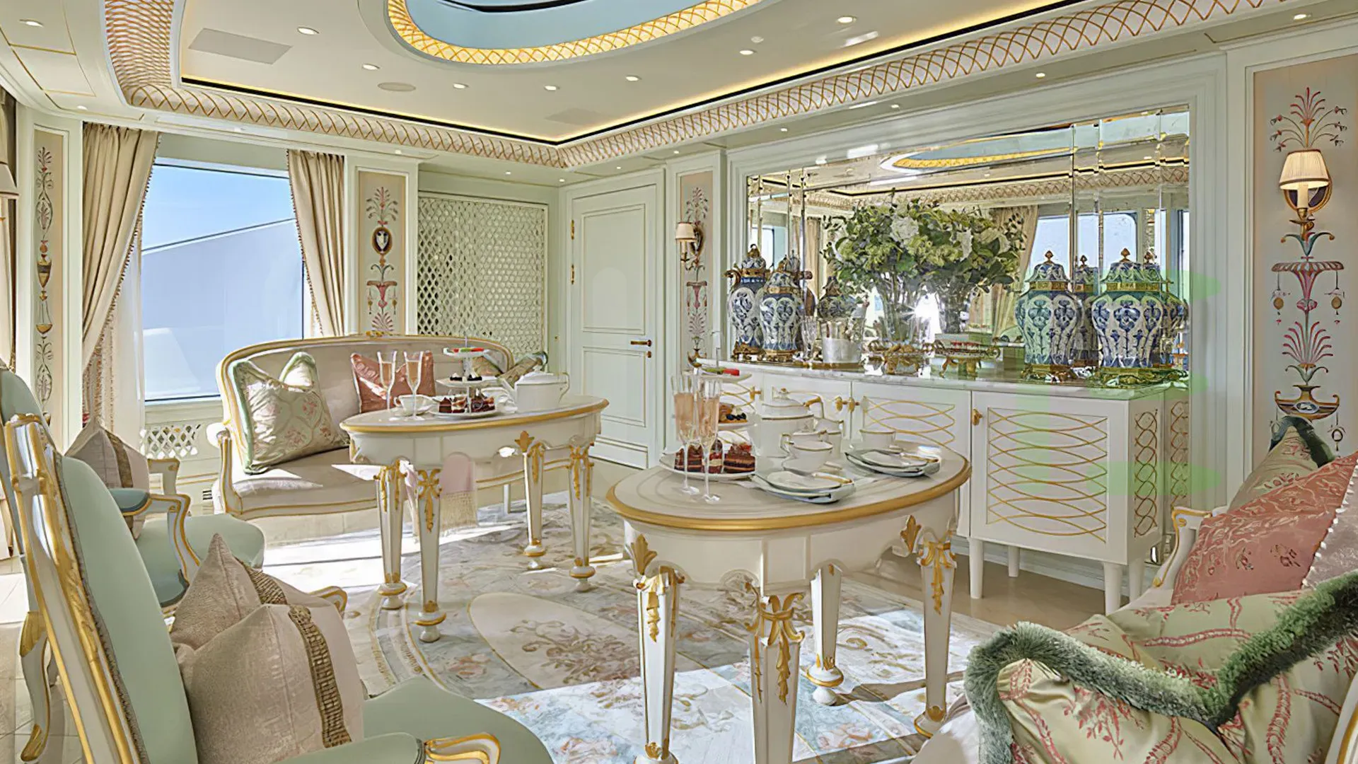 Her features include a spa, beauty salon, elevator, underwater lights, beach club, gym and air conditioning.