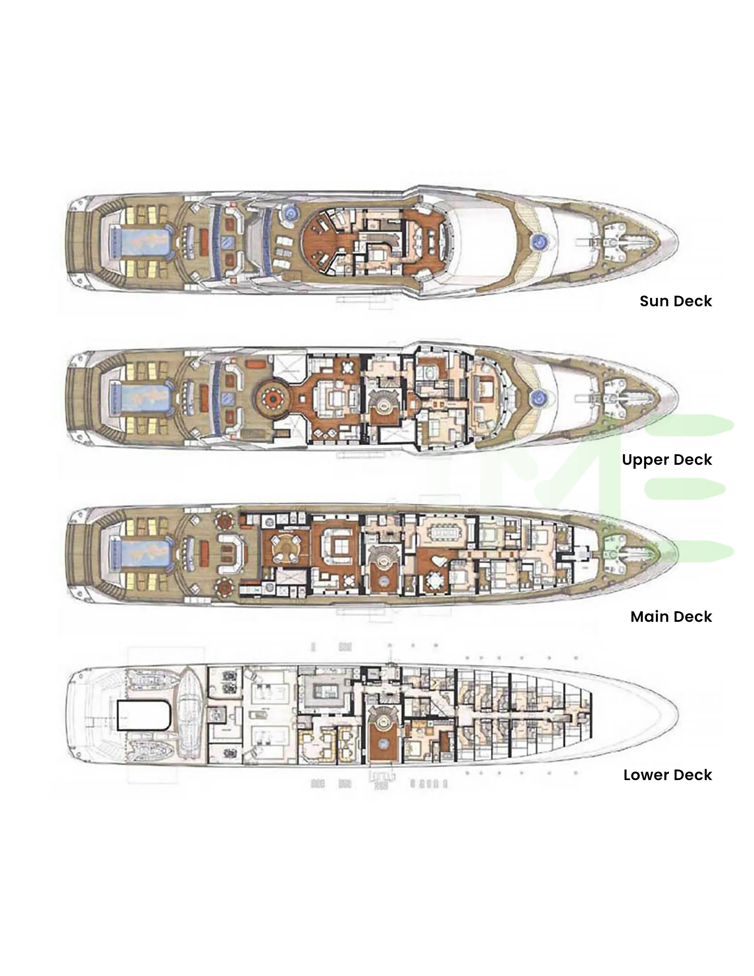 Request plans that include the layout of staterooms, guest areas, and outdoor spaces, as well as crew quarters and work areas.