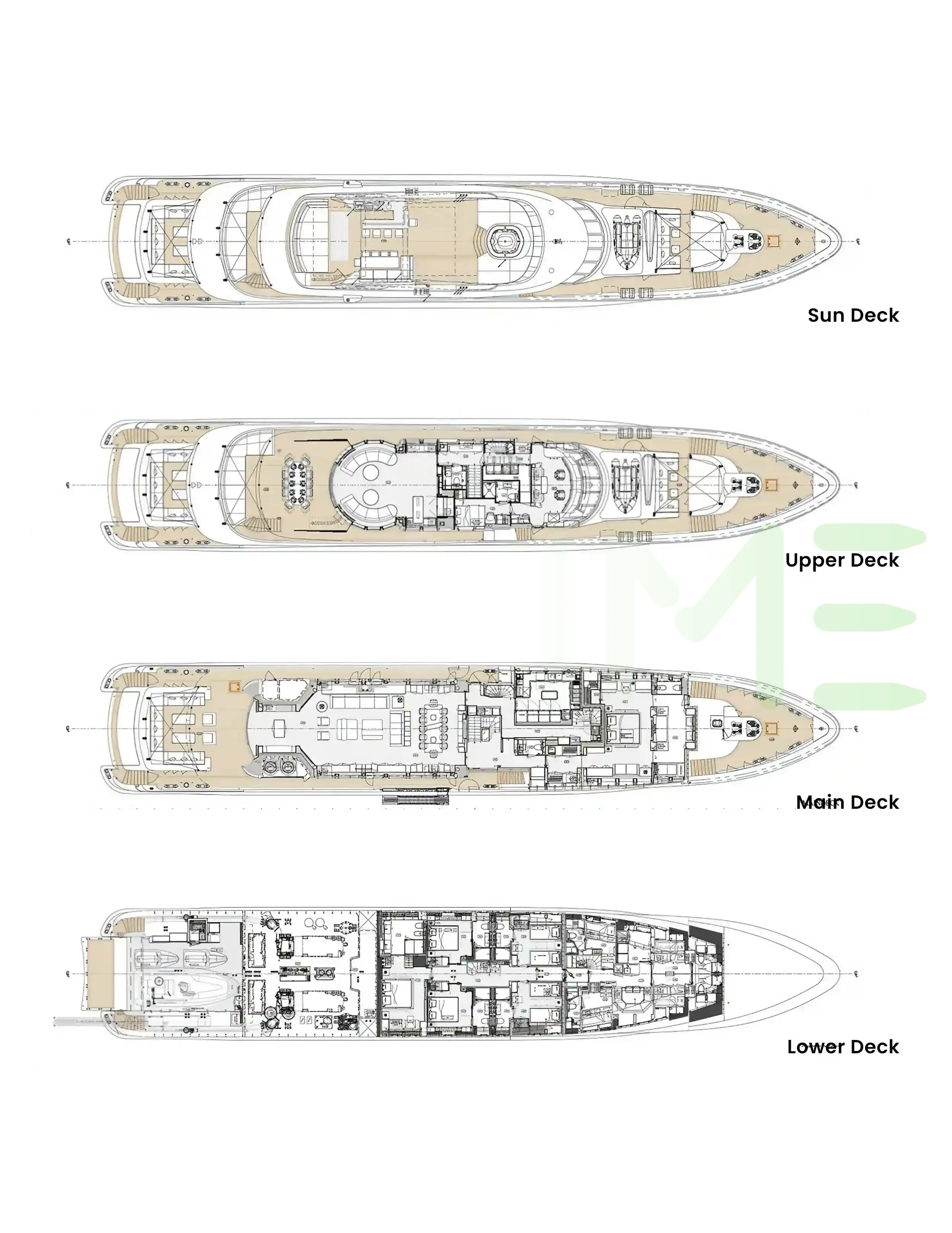 Request plans that include the layout of staterooms, guest areas, and outdoor spaces, as well as crew quarters and work areas.