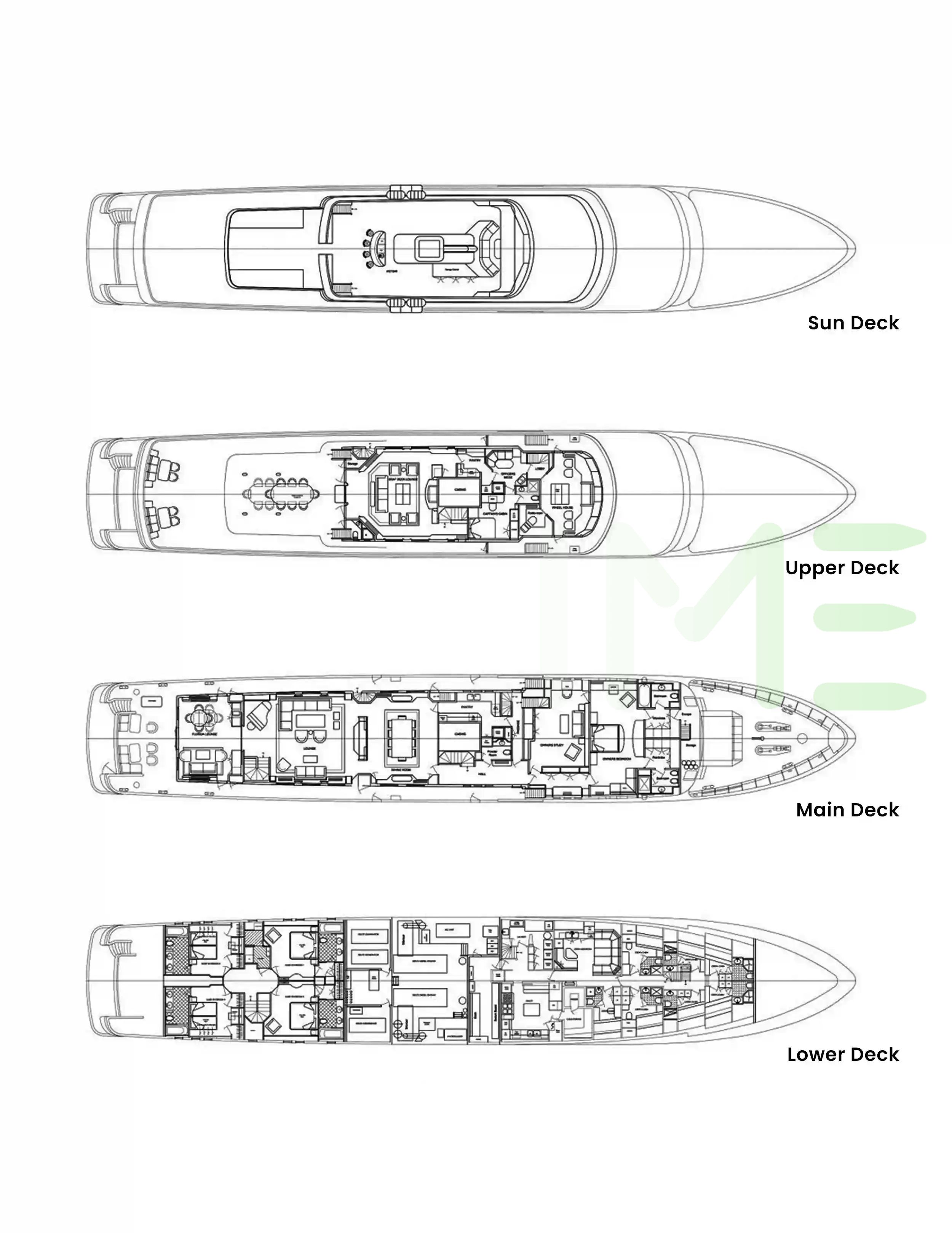 Request plans that include the layout of staterooms, guest areas, and outdoor spaces, as well as crew quarters and work areas.