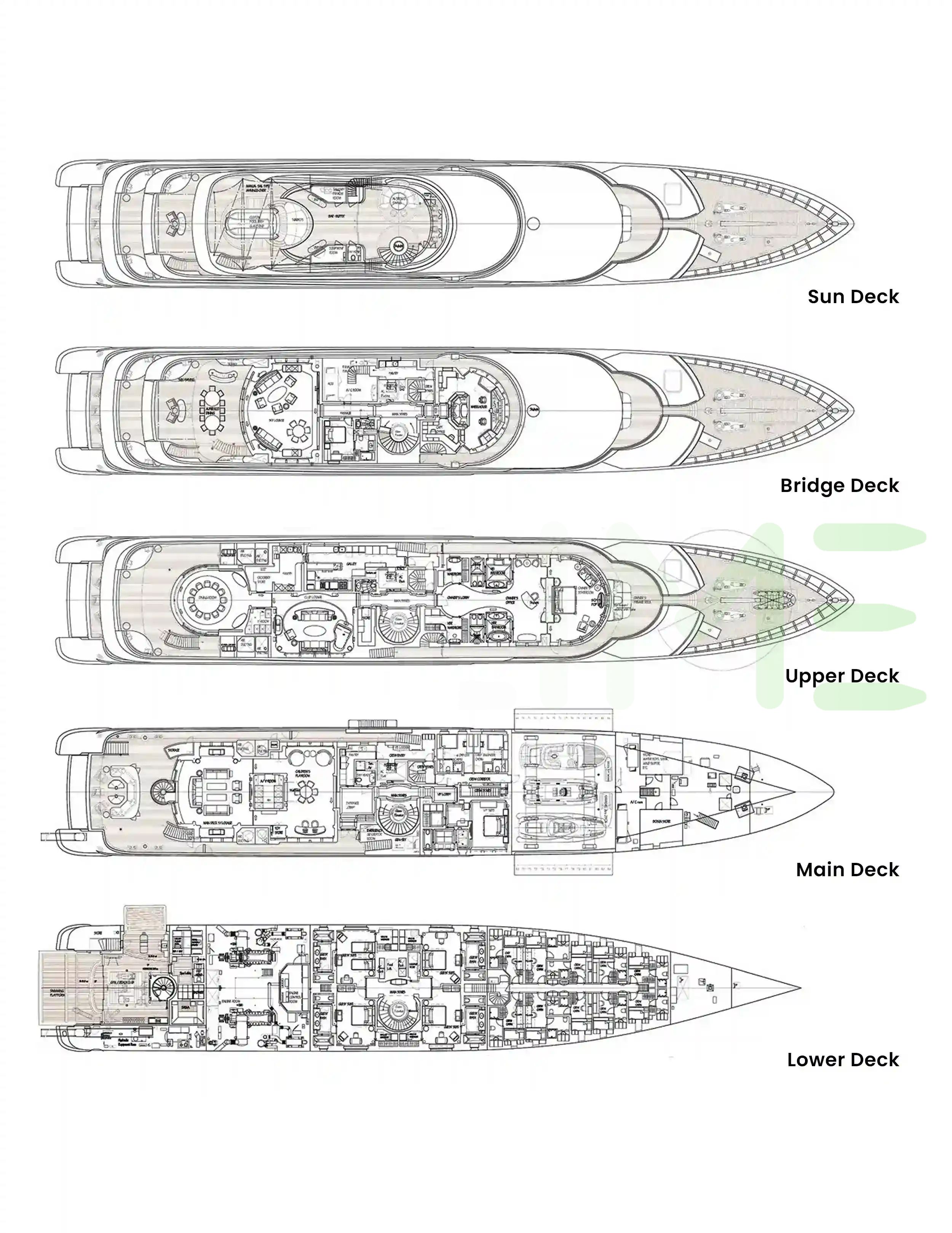 Request plans that include the layout of staterooms, guest areas, and outdoor spaces, as well as crew quarters and work areas.