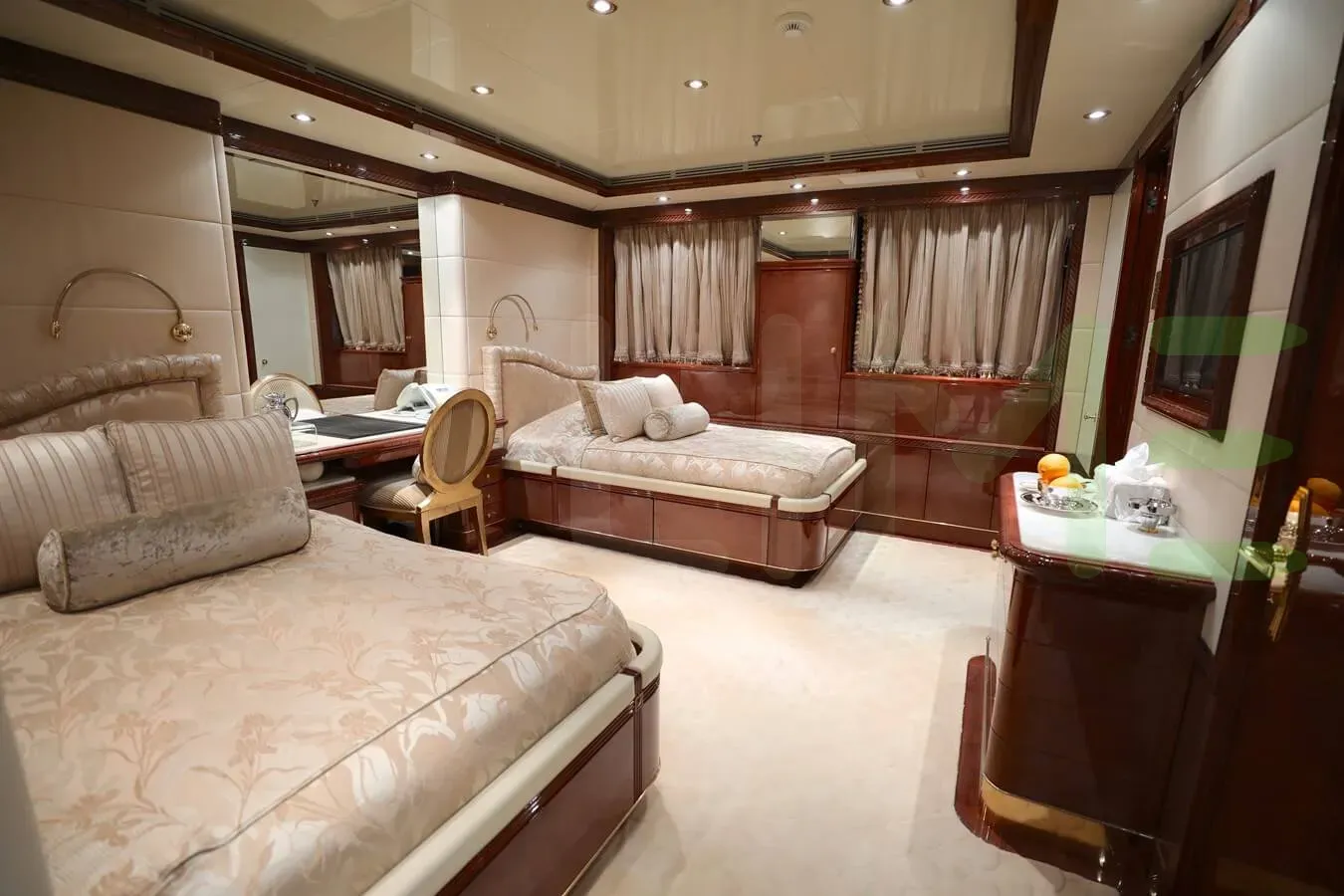 Her features include a spa, beauty salon, elevator, beach club, gym and air conditioning.