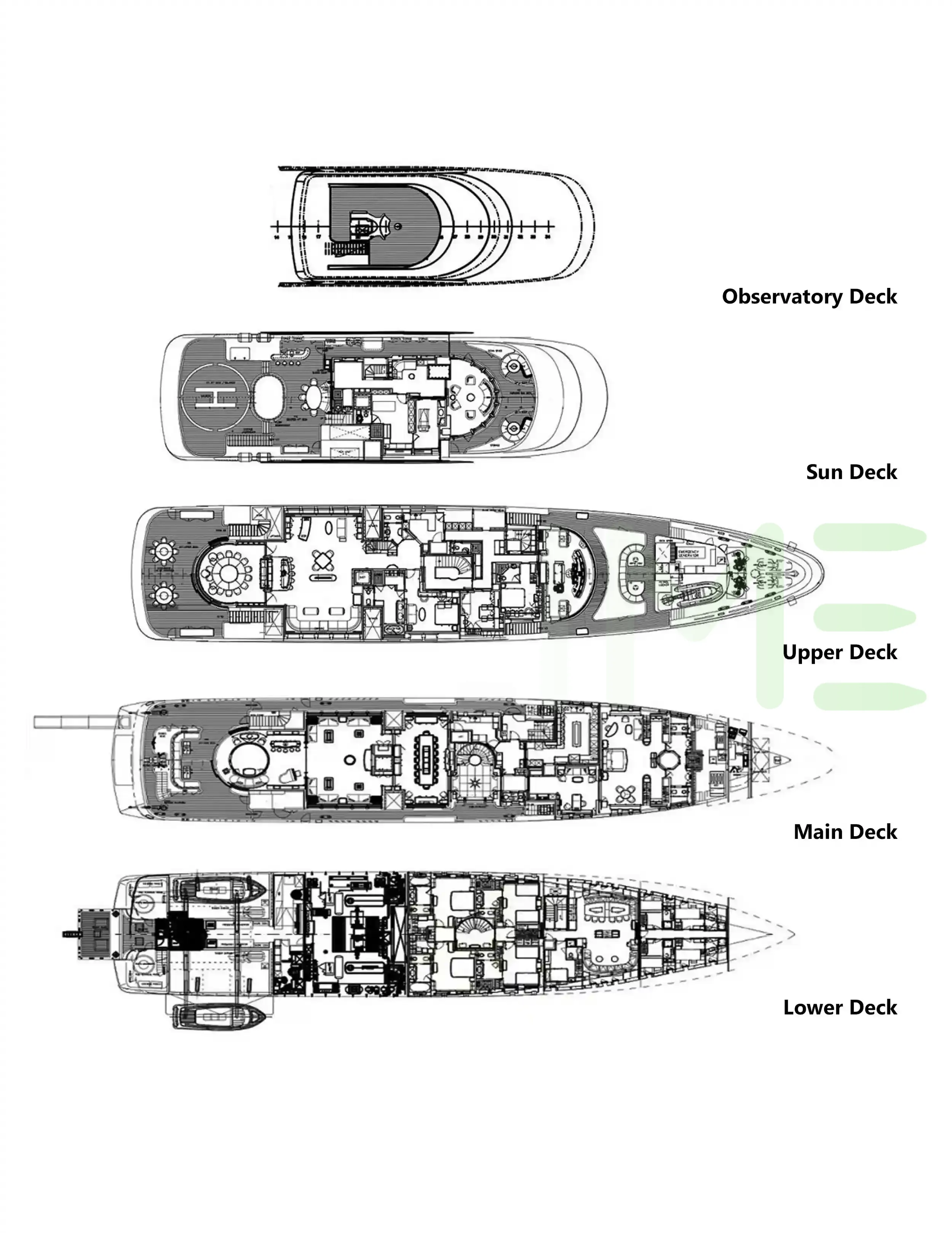 Request plans that include the layout of staterooms, guest areas, and outdoor spaces, as well as crew quarters and work areas.