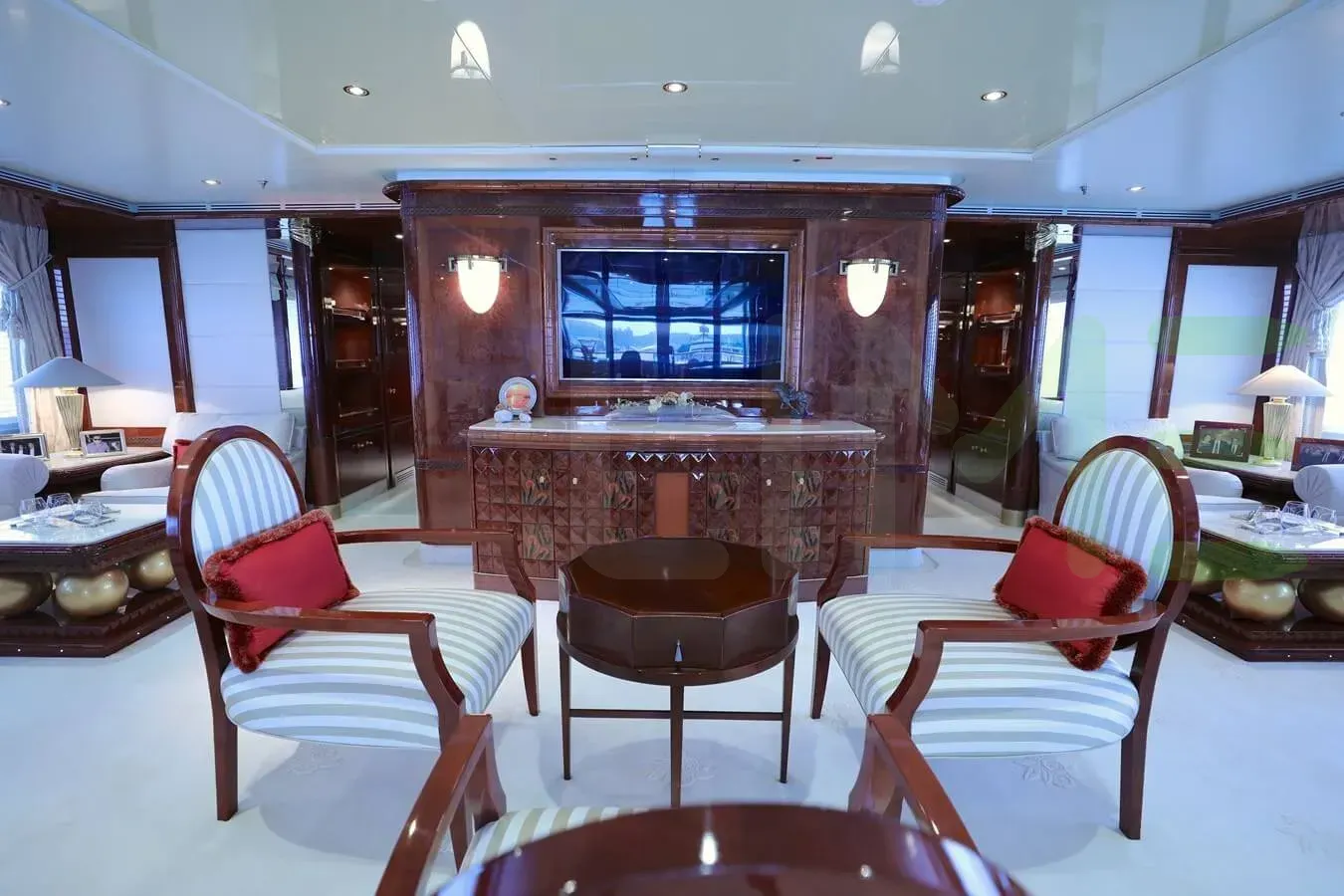 The styling of the AMER yacht features exterior design by Stefano Natucci and interior design by Zuretti Interior Design. Up to 12 guests can be accommodated on board the superyacht AMER in 6 staterooms. AMER also has accommodations for 20 crew members, including the yacht’s captain.