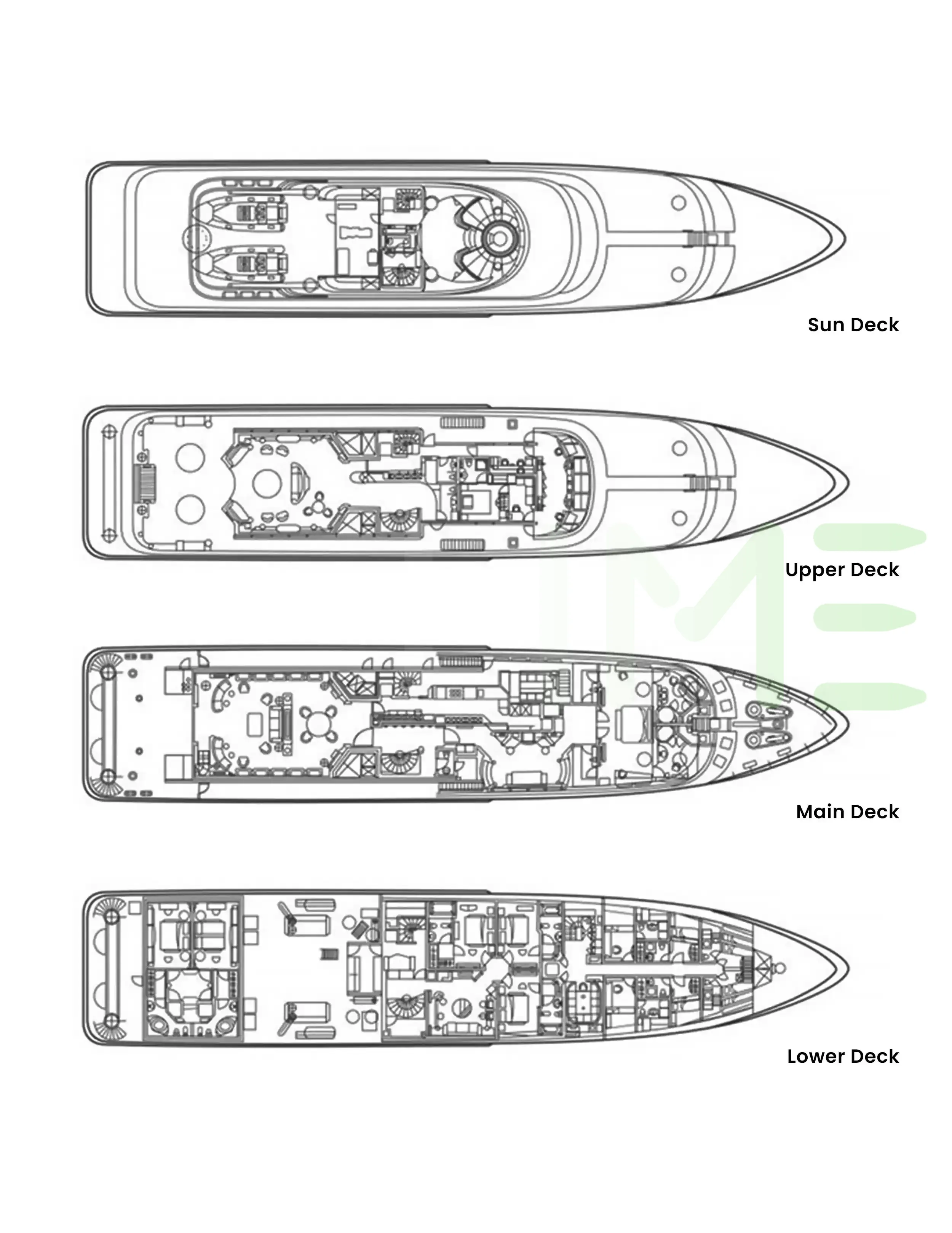 Request plans that include the layout of staterooms, guest areas, and outdoor spaces, as well as crew quarters and work areas.