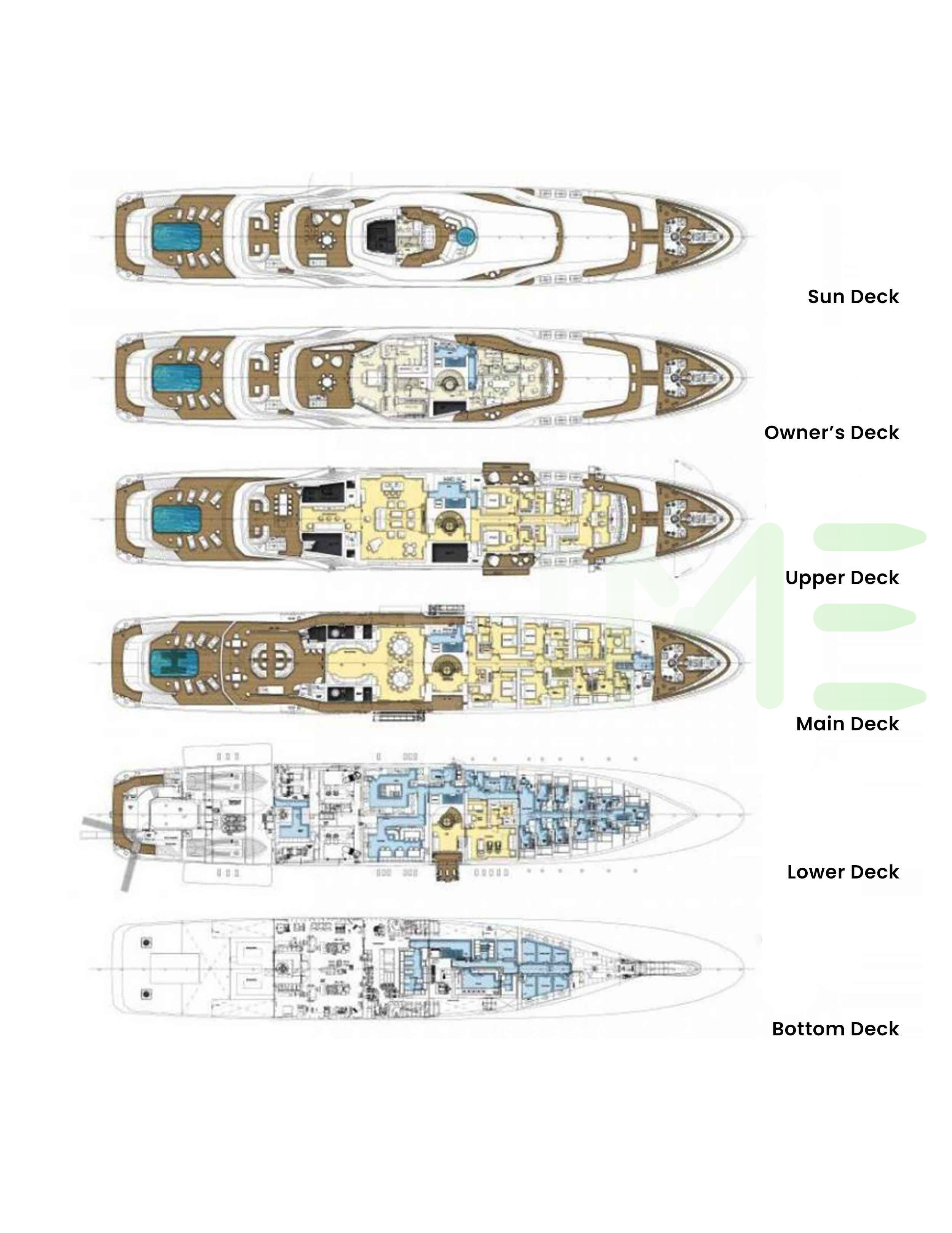 Request plans that include the layout of staterooms, guest areas, and outdoor spaces, as well as crew quarters and work areas.