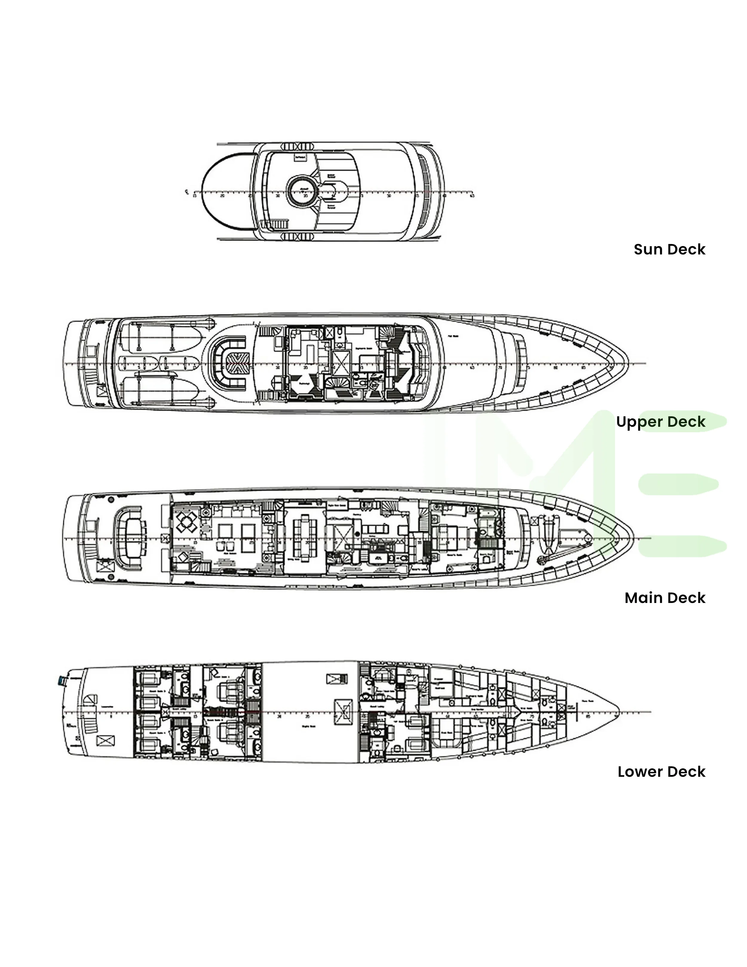 Request plans that include the layout of staterooms, guest areas, and outdoor spaces, as well as crew quarters and work areas.