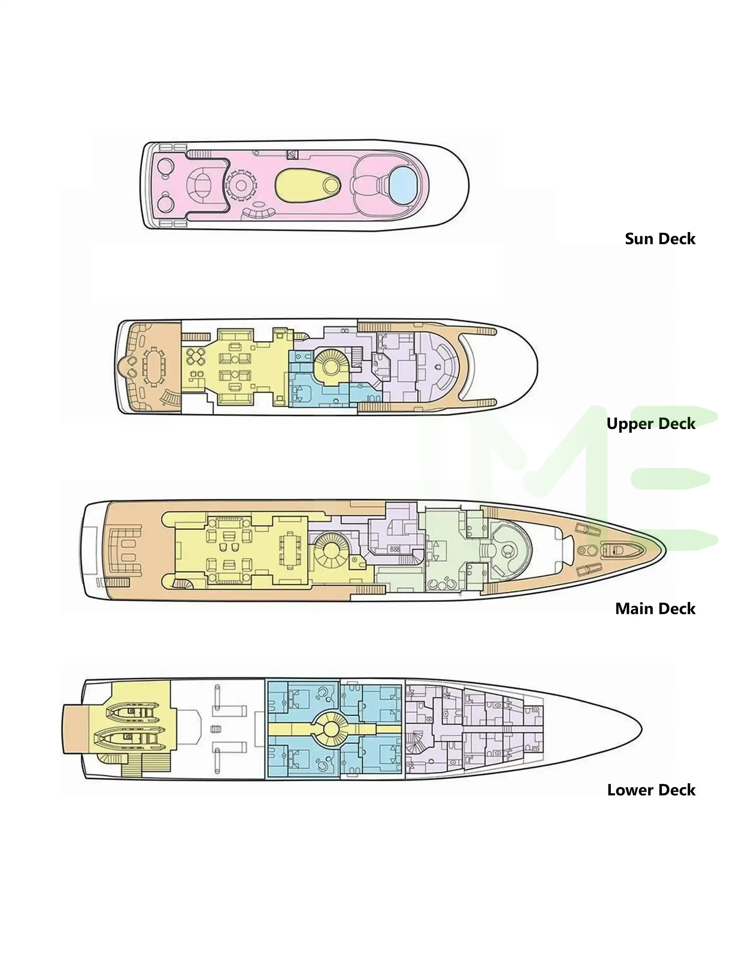 Request plans that include the layout of staterooms, guest areas, and outdoor spaces, as well as crew quarters and work areas.