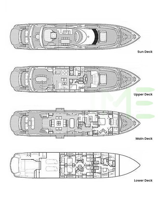 Request plans that include the layout of staterooms, guest areas, and outdoor spaces, as well as crew quarters and work areas.