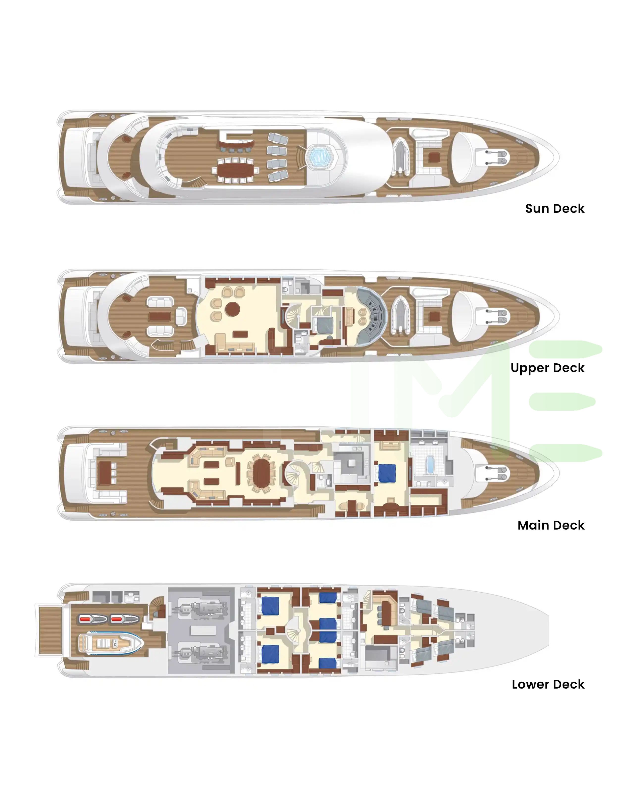 Request plans that include the layout of staterooms, guest areas, and outdoor spaces, as well as crew quarters and work areas.