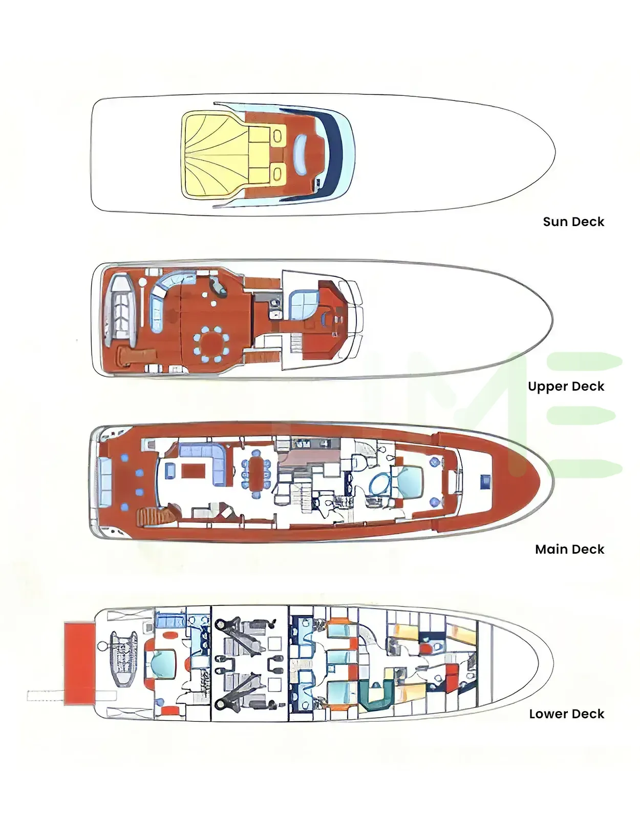 Request plans that include the layout of staterooms, guest areas, and outdoor spaces, as well as crew quarters and work areas.
