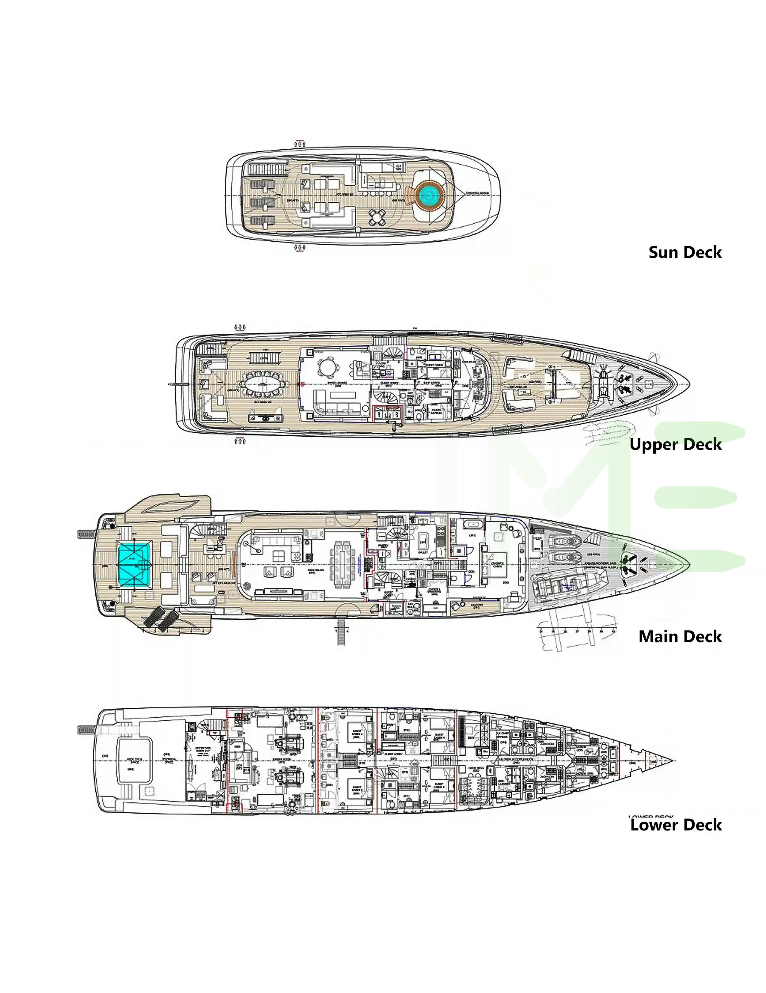 Request plans that include the layout of staterooms, guest areas, and outdoor spaces, as well as crew quarters and work areas.