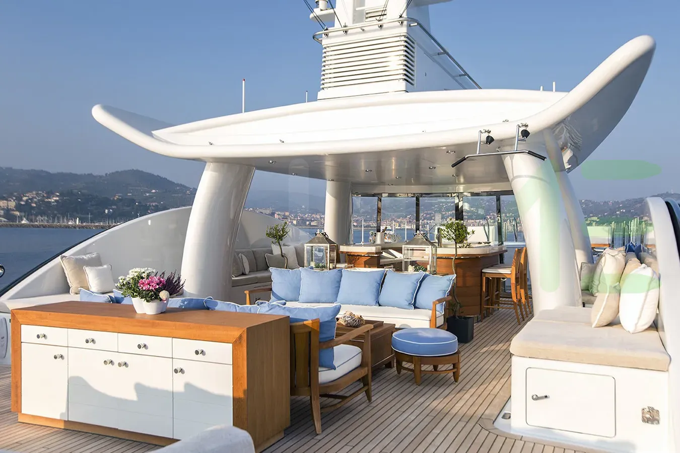 Her features include steam room, spa, satellite communications, beach club, gym, deck jacuzzi, WiFi and air conditioning.