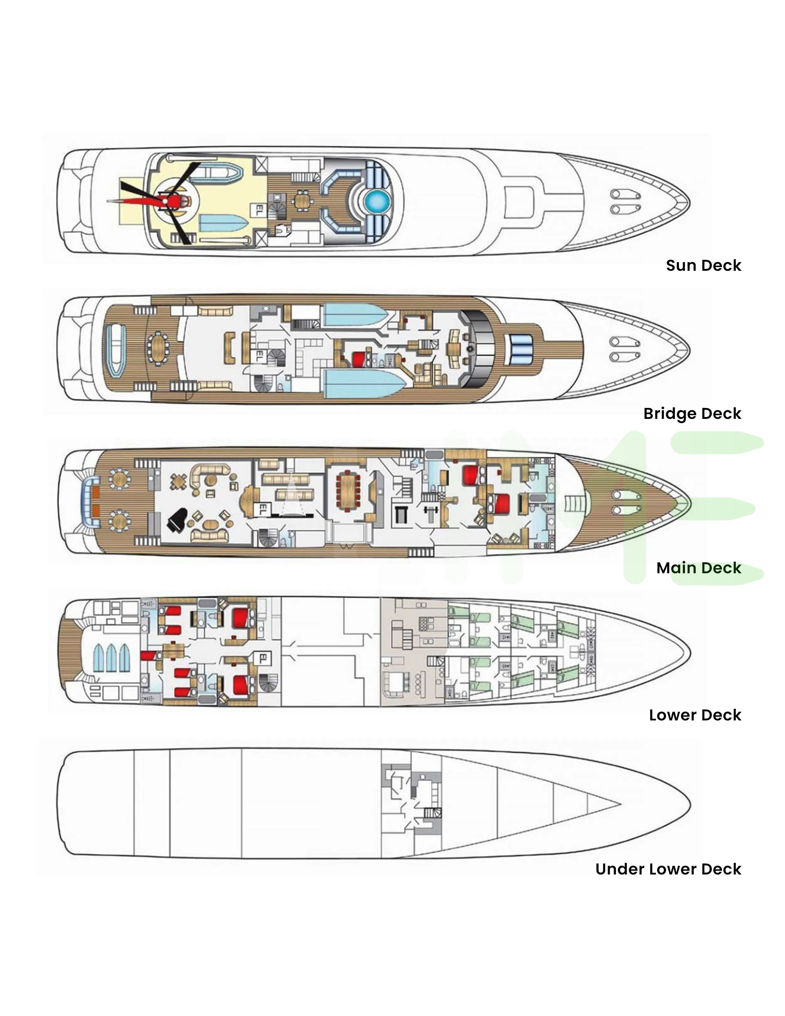 Request plans that include the layout of staterooms, guest areas, and outdoor spaces, as well as crew quarters and work areas.
