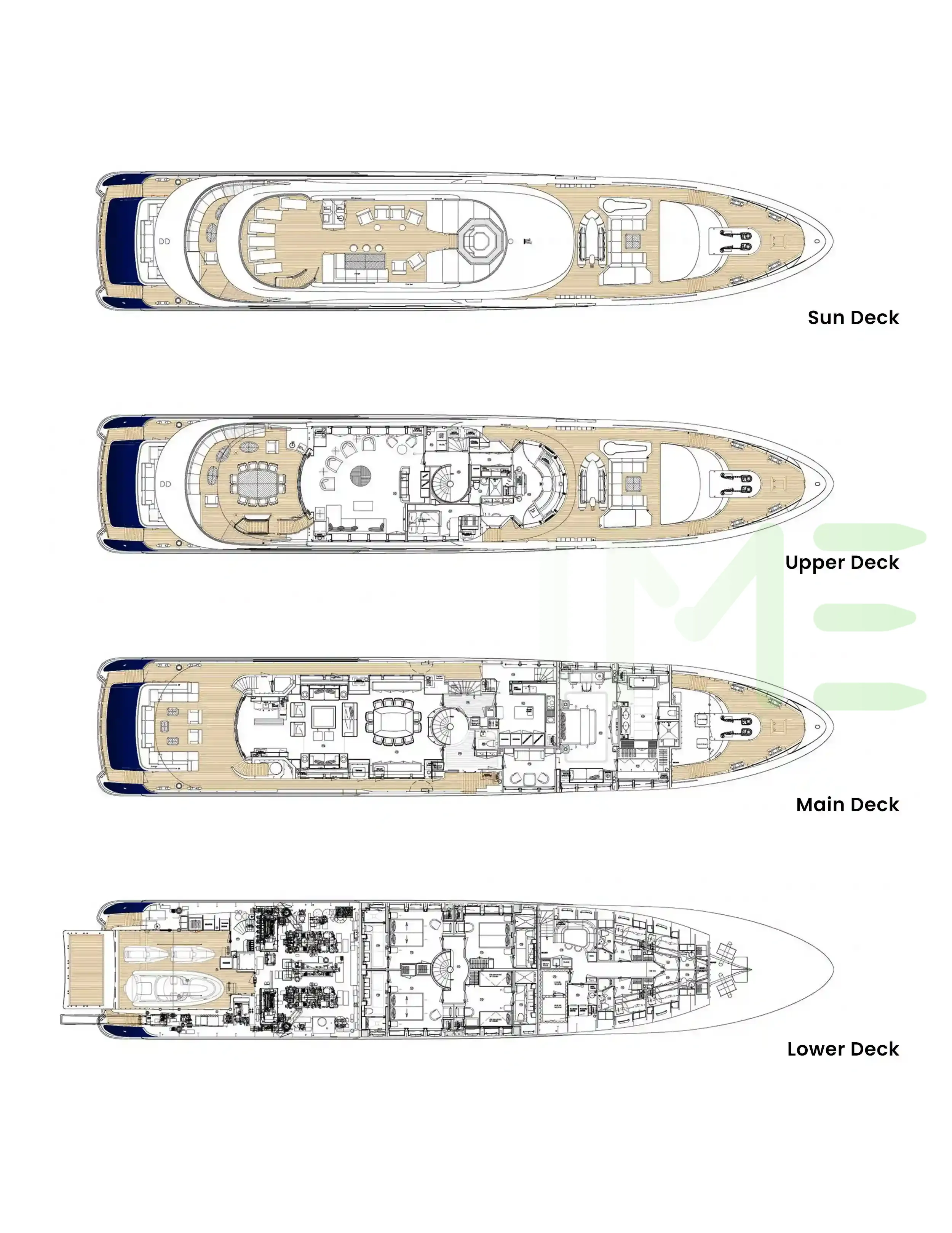 Request plans that include the layout of staterooms, guest areas, and outdoor spaces, as well as crew quarters and work areas.