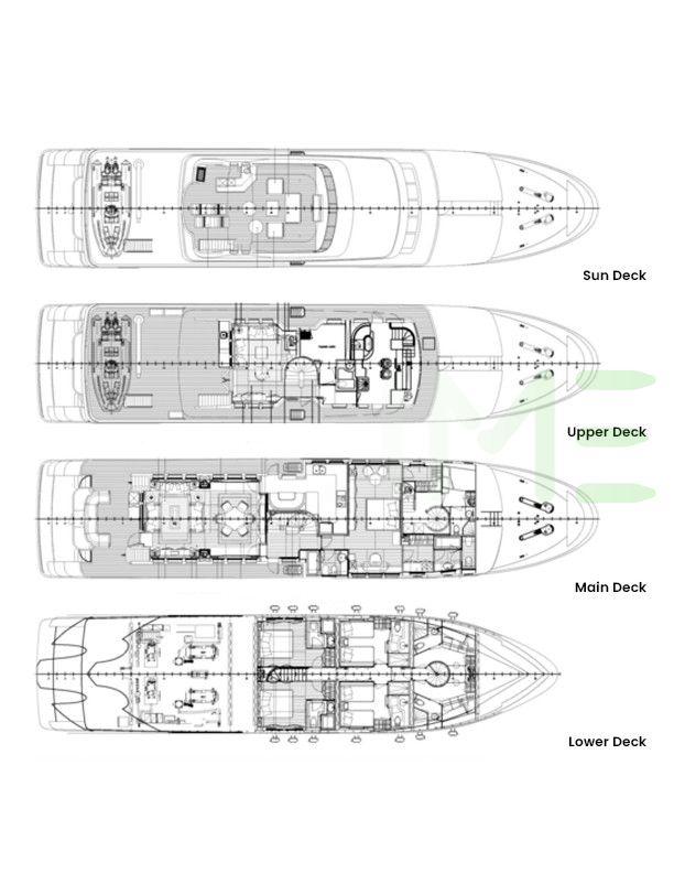 Request plans that include the layout of staterooms, guest areas, and outdoor spaces, as well as crew quarters and work areas.