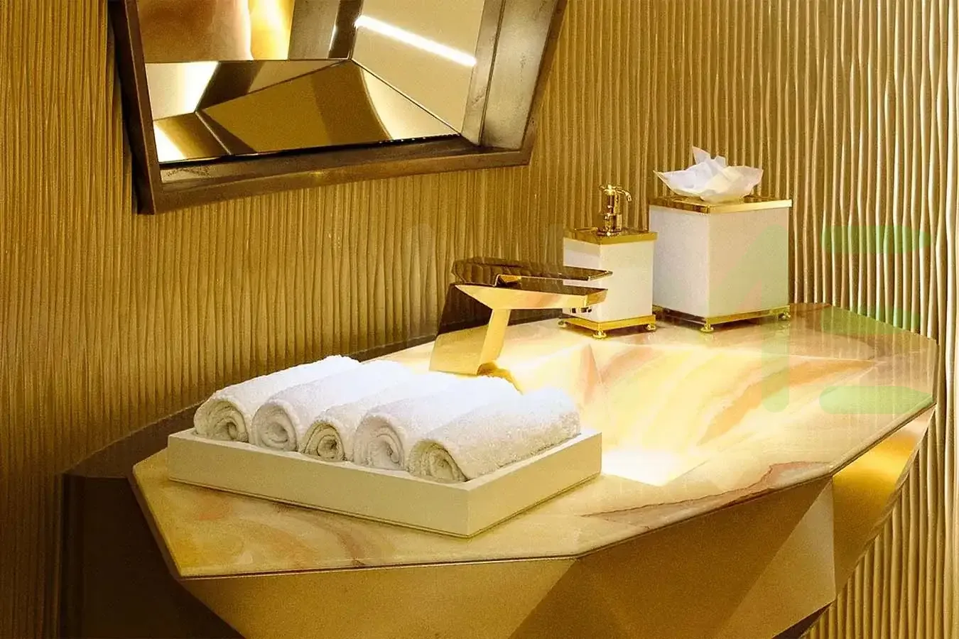Her features include piano, elevator, underwater lights, beach club, gym and air conditioning.