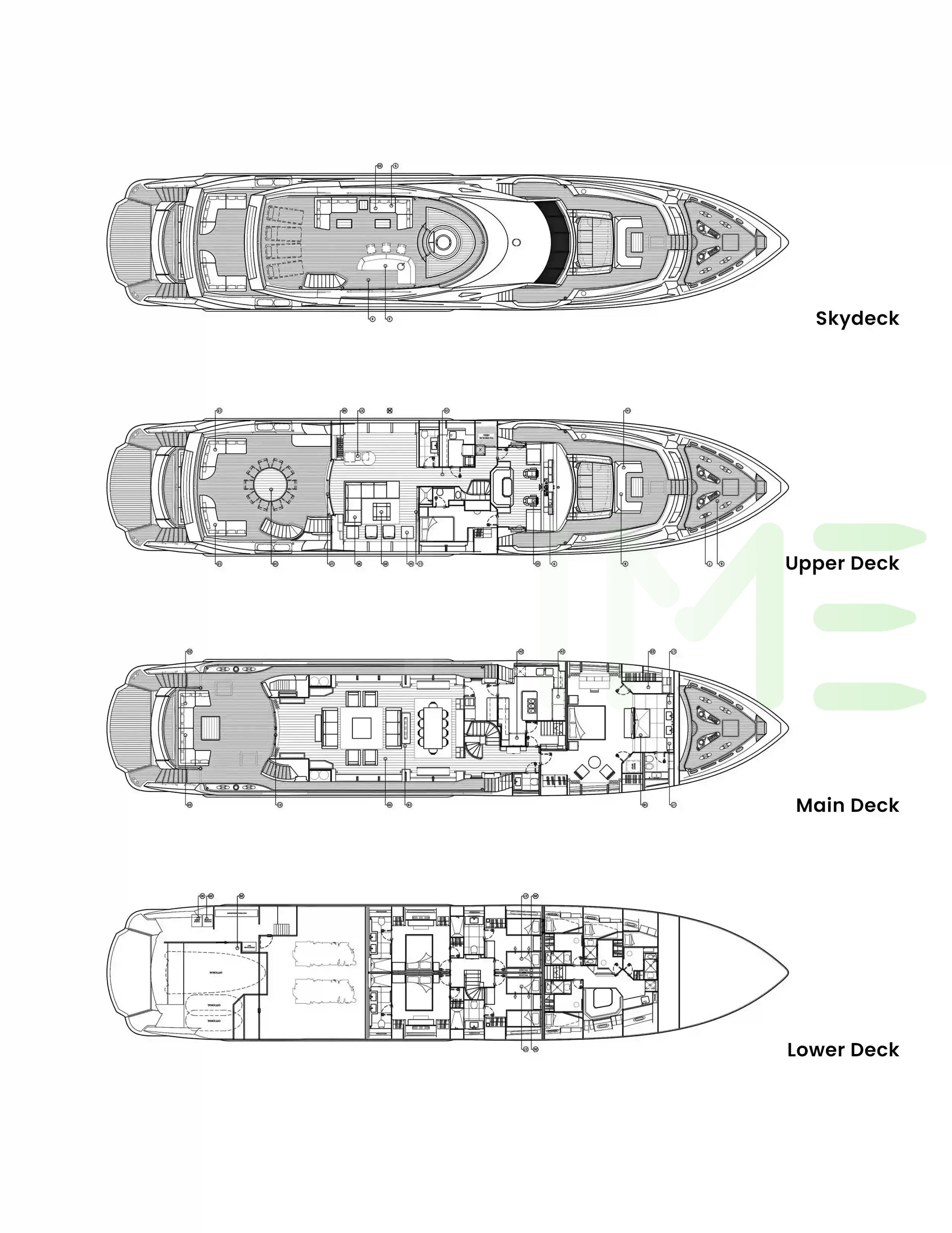 Request plans that include the layout of staterooms, guest areas, and outdoor spaces, as well as crew quarters and work areas.
