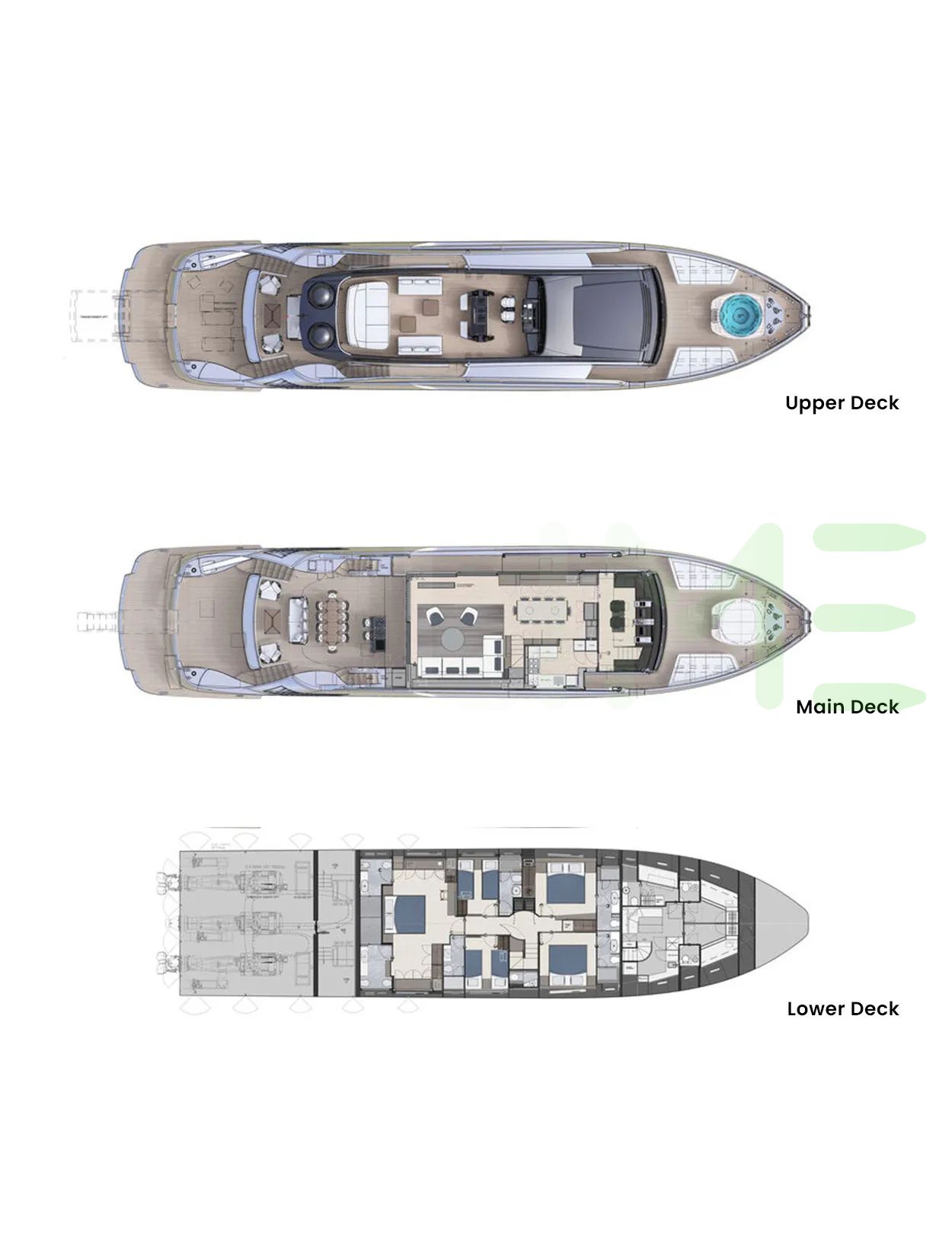 Request plans that include the layout of staterooms, guest areas, and outdoor spaces, as well as crew quarters and work areas.