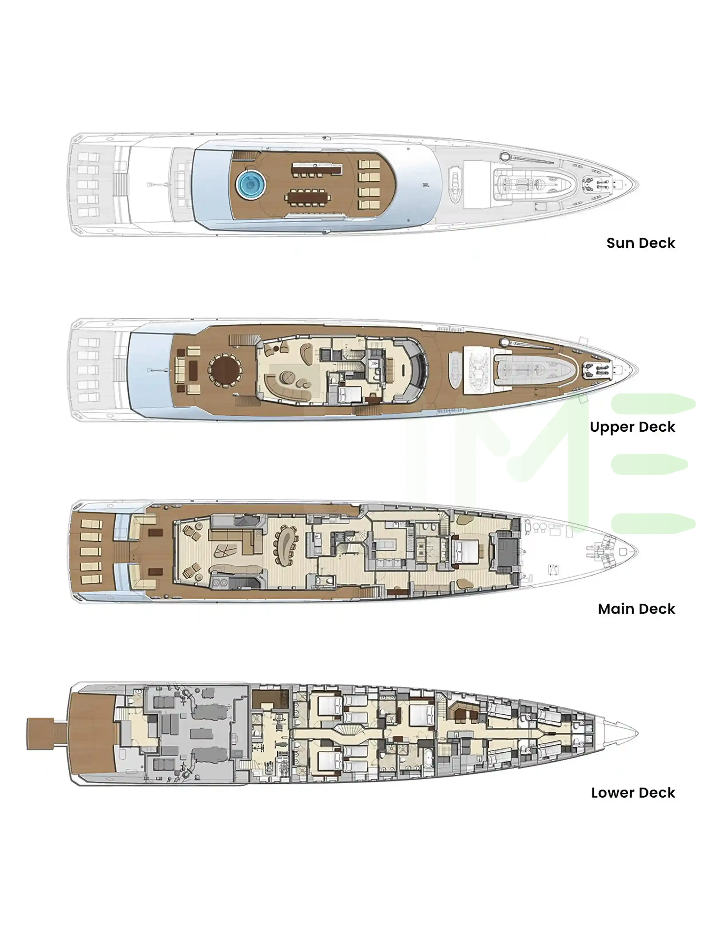 Request plans that include the layout of staterooms, guest areas, and outdoor spaces, as well as crew quarters and work areas.