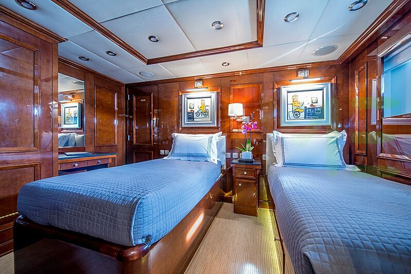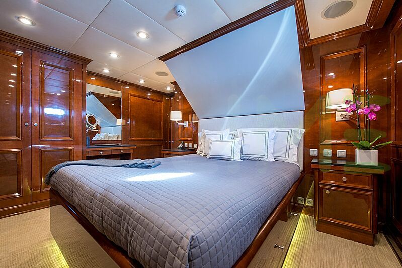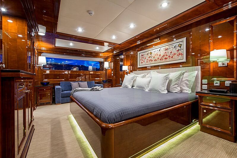The styling of the DE-DE yacht features exterior design by Stirling Design International and interior design by Bonville Associates. Up to 10 guests can be accommodated on board the superyacht DE-DE in 5 staterooms. DE-DE also has accommodations for 10 crew members, including the yacht’s captain.