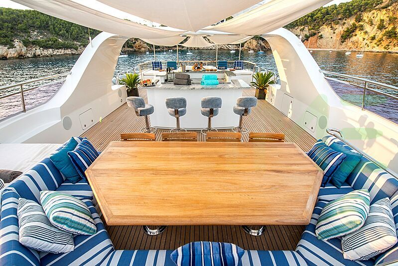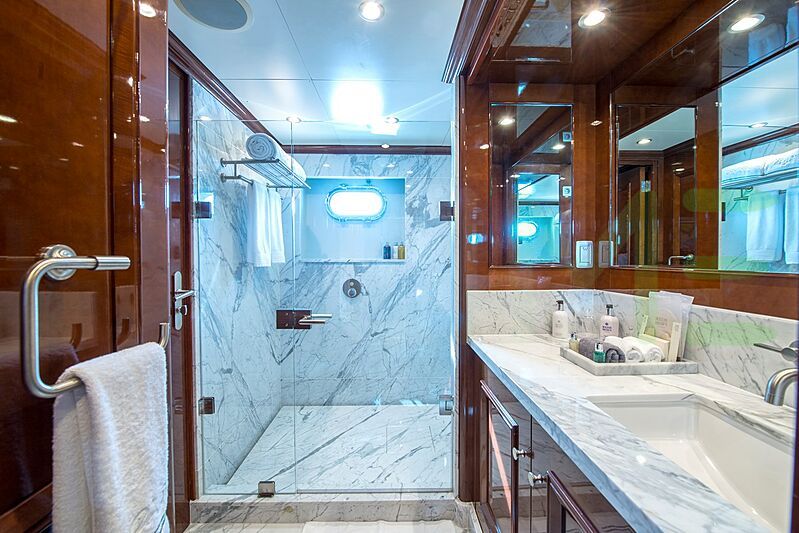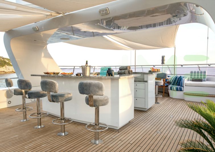 Her features include underwater lights, gym, deck jacuzzi, WiFi and air conditioning.