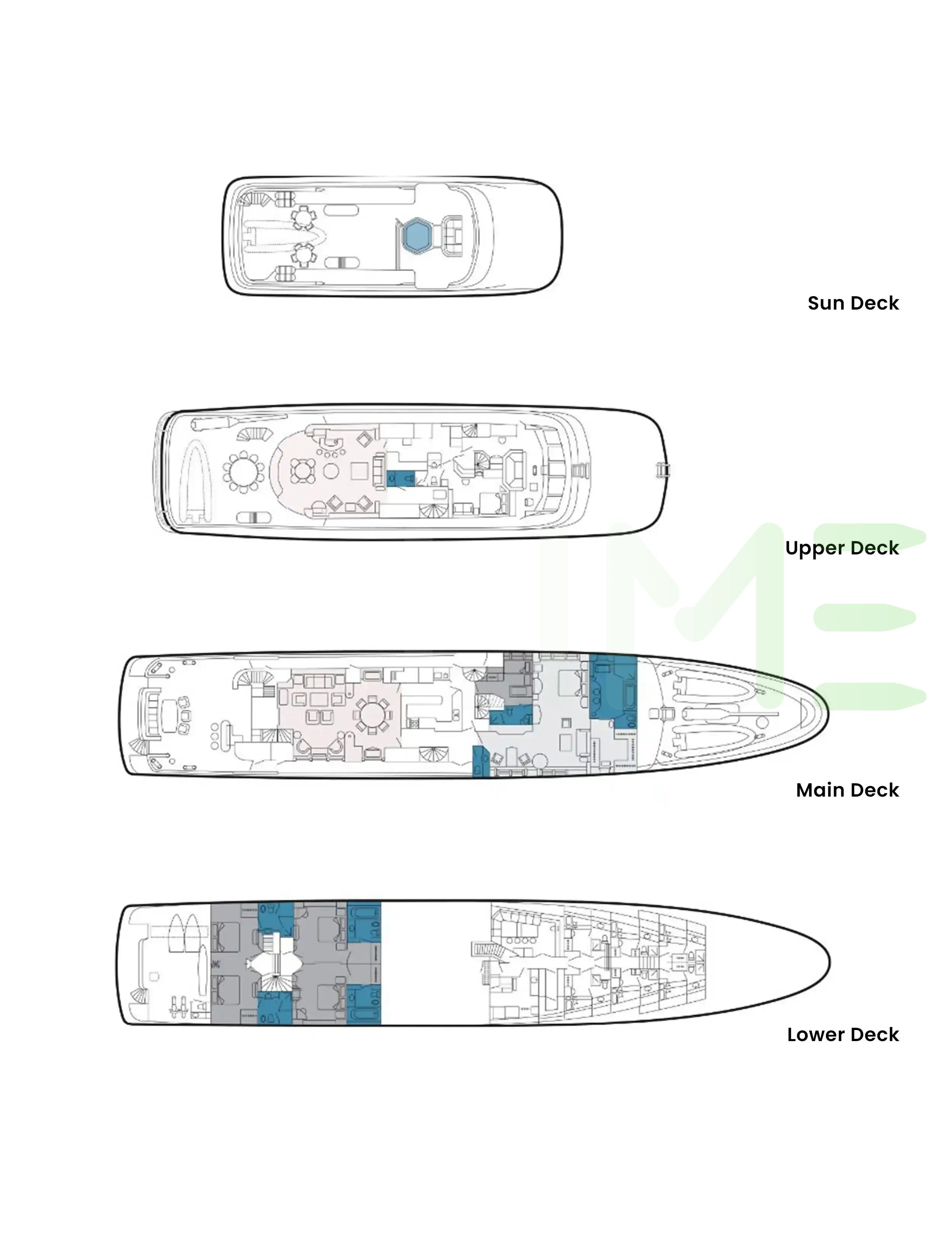 Request plans that include the layout of staterooms, guest areas, and outdoor spaces, as well as crew quarters and work areas.