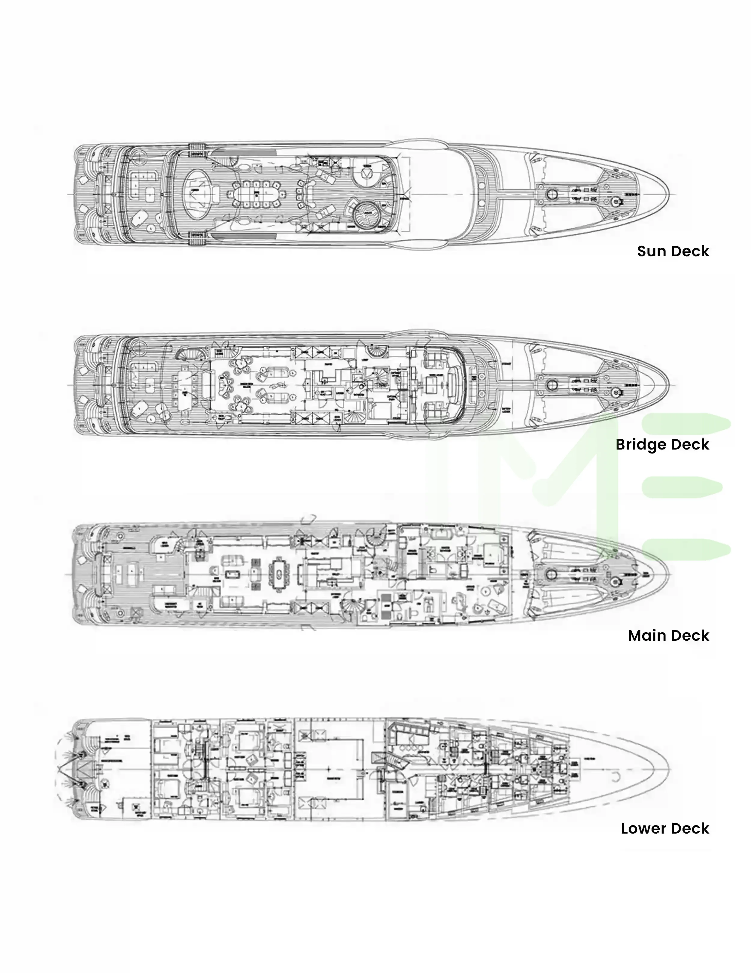 Request plans that include the layout of staterooms, guest areas, and outdoor spaces, as well as crew quarters and work areas.