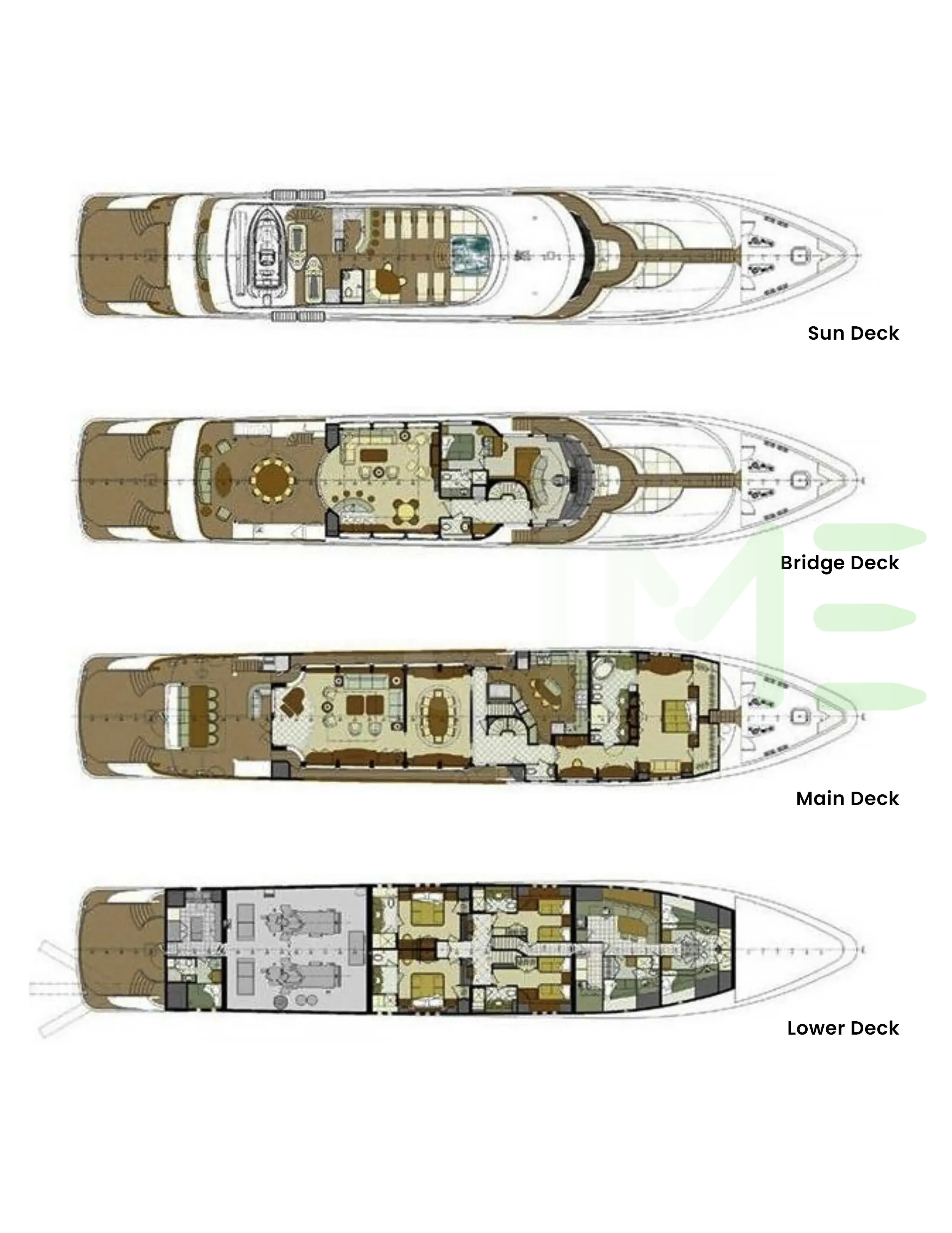 Request plans that include the layout of staterooms, guest areas, and outdoor spaces, as well as crew quarters and work areas.