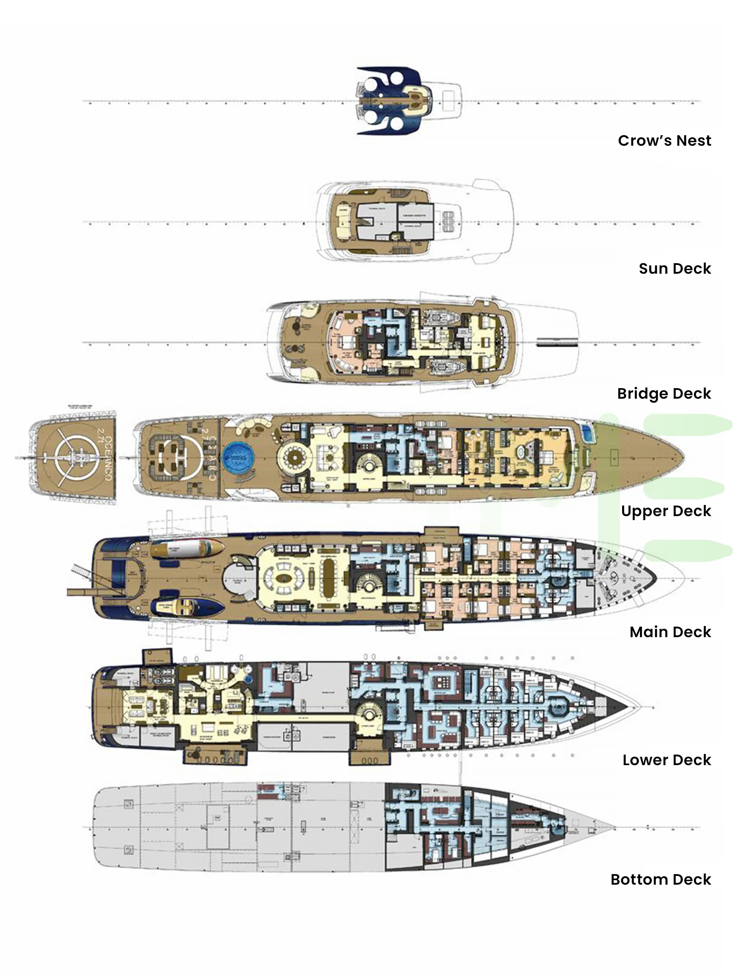 Request plans that include the layout of staterooms, guest areas, and outdoor spaces, as well as crew quarters and work areas.
