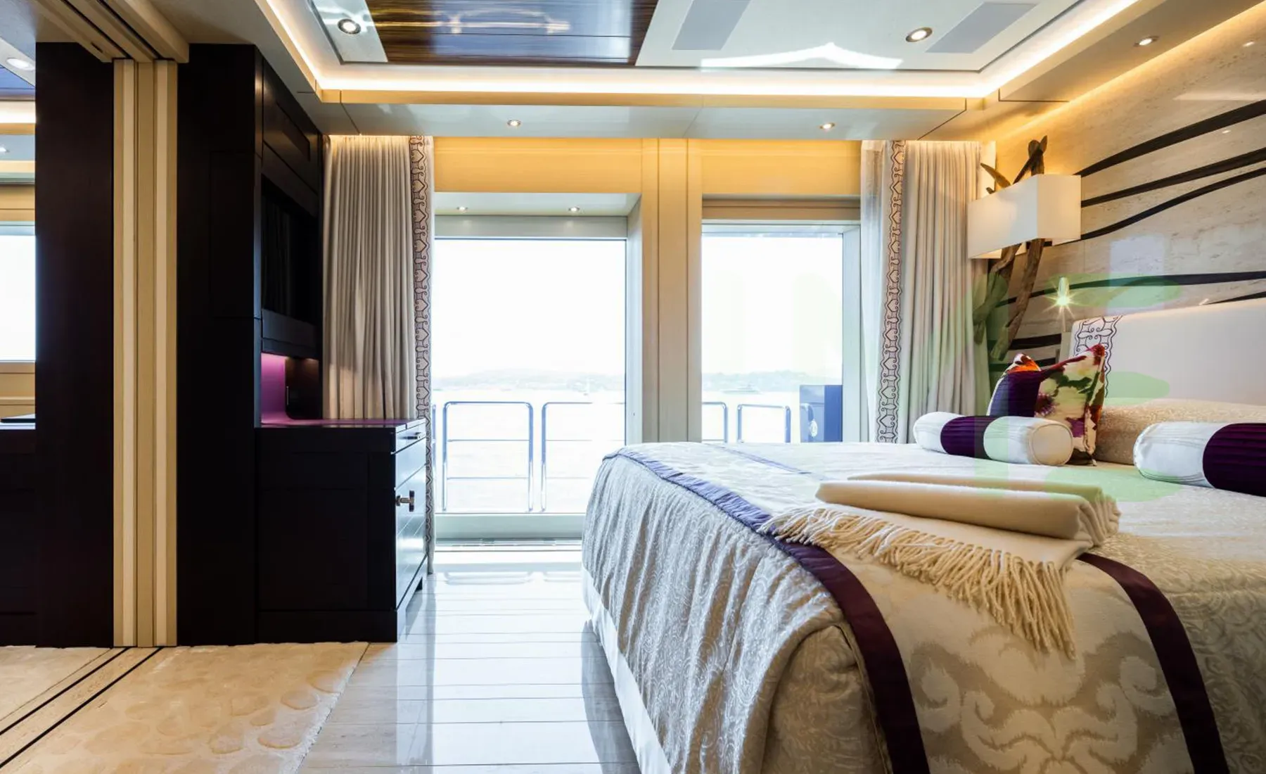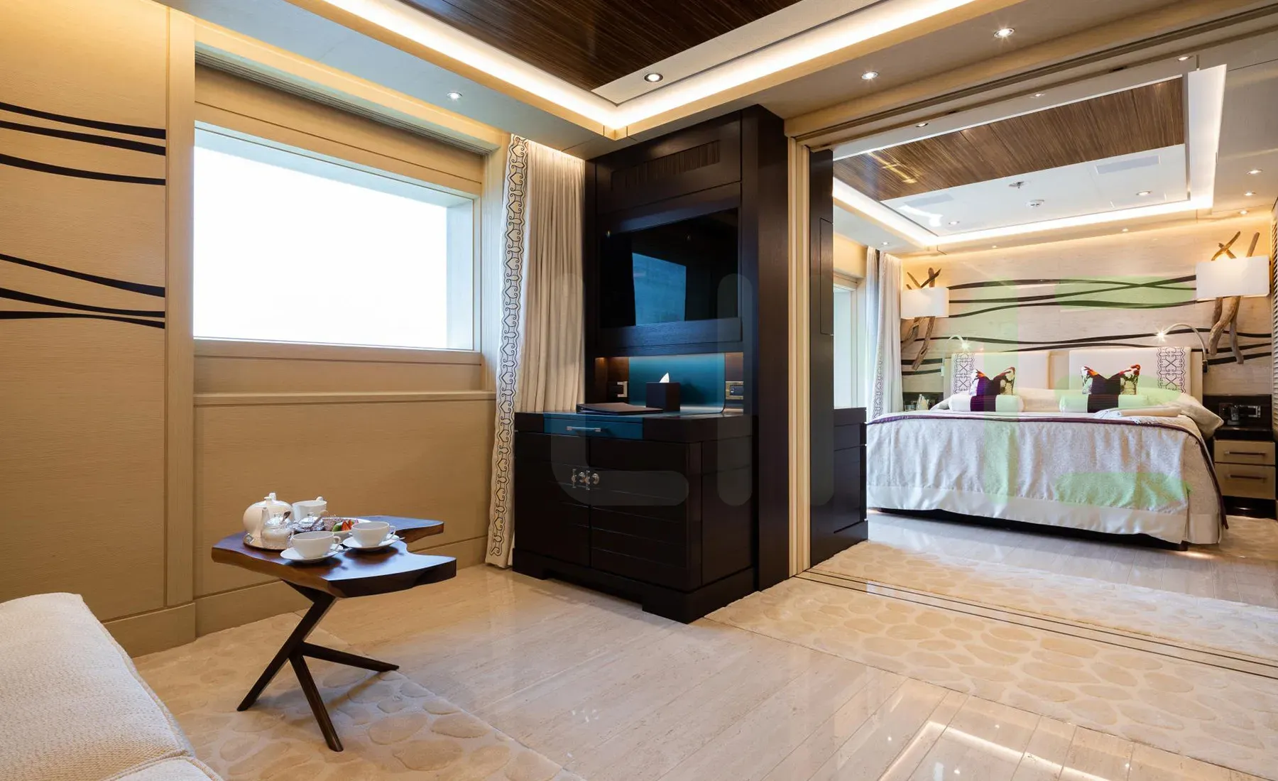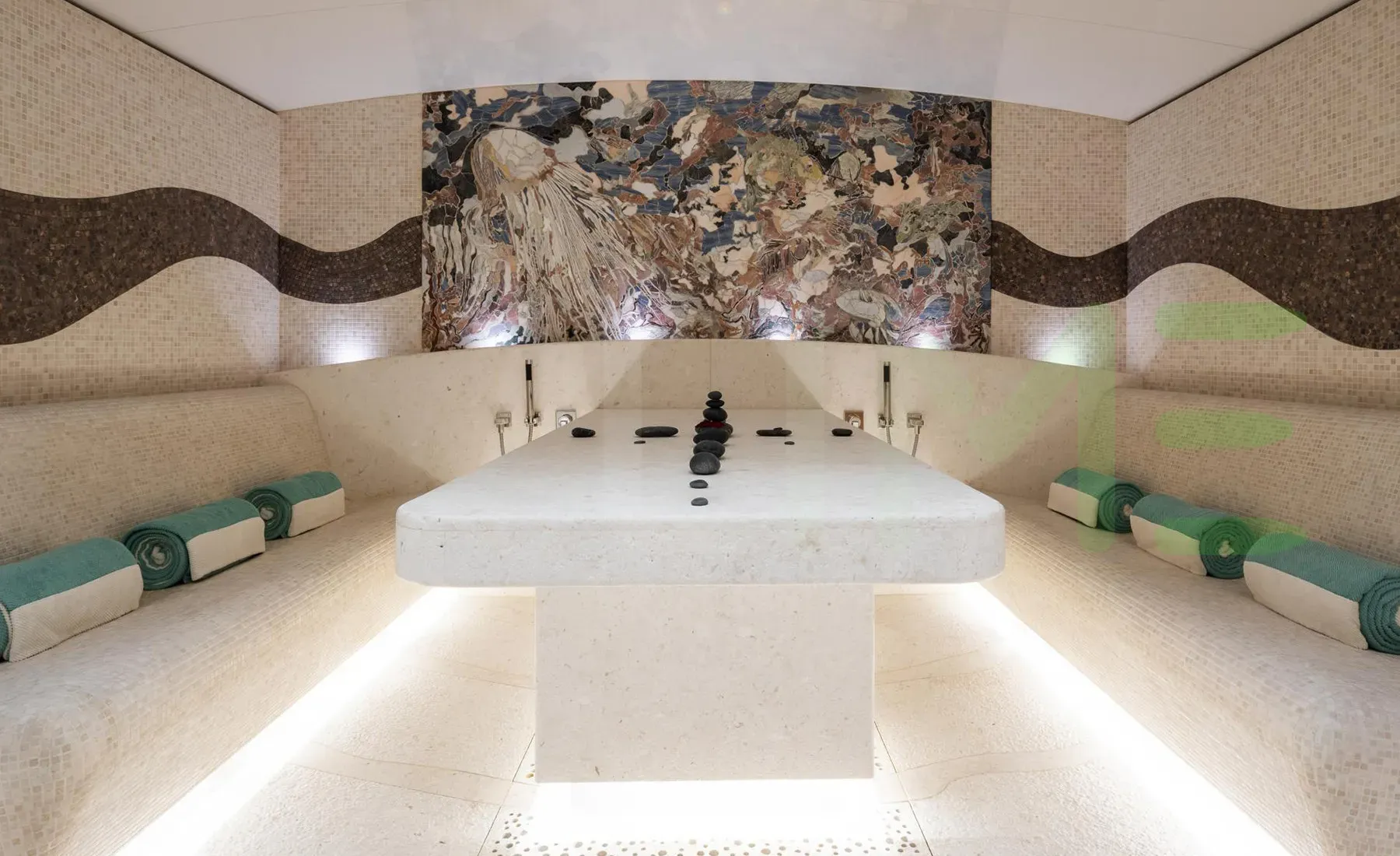 A charter on Tranquility is comfortable and convenient thanks to the provided amenities such as a piano, perfect for creating a relaxed atmosphere for you and your guests. Meanwhile Tranquility boasts a movie theatre, perfect to relax after a long day on the water. Alternatively the latest beauty and hair treatments are available in the luxurious beauty room or relieve aches from a busy day on the water in the steam room. Kick back and relax in the well-appointed spa or elsewhere, visit the sauna and disconnect in peace and quiet. The swimming pool is perfect for exercising or admiring a romantic sunrise. Head to the beach club and take advantage of indoor-outdoor living and entertaining and a gym with all the latest equipment is available for a good work out. Sit back with a glass of champagne in the deck jacuzzi.