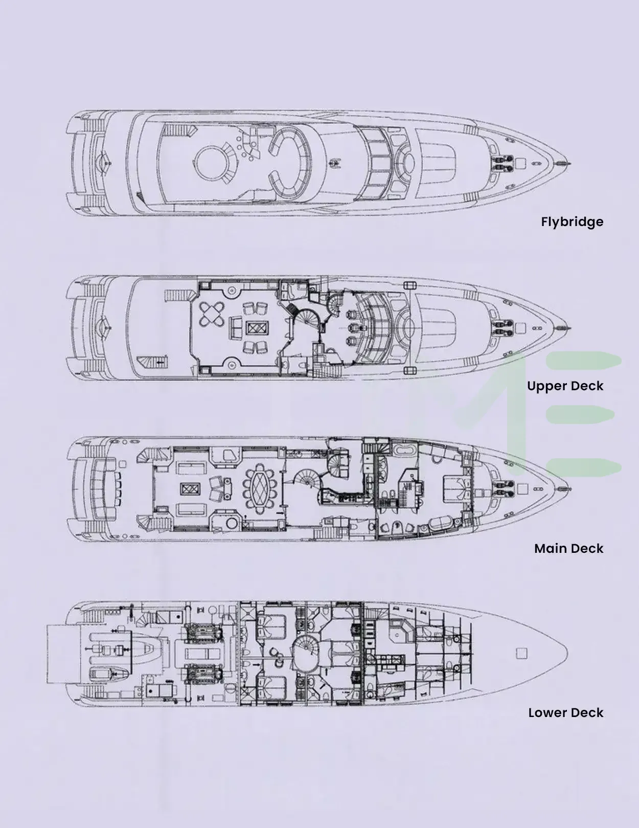 Request plans that include the layout of staterooms, guest areas, and outdoor spaces, as well as crew quarters and work areas.