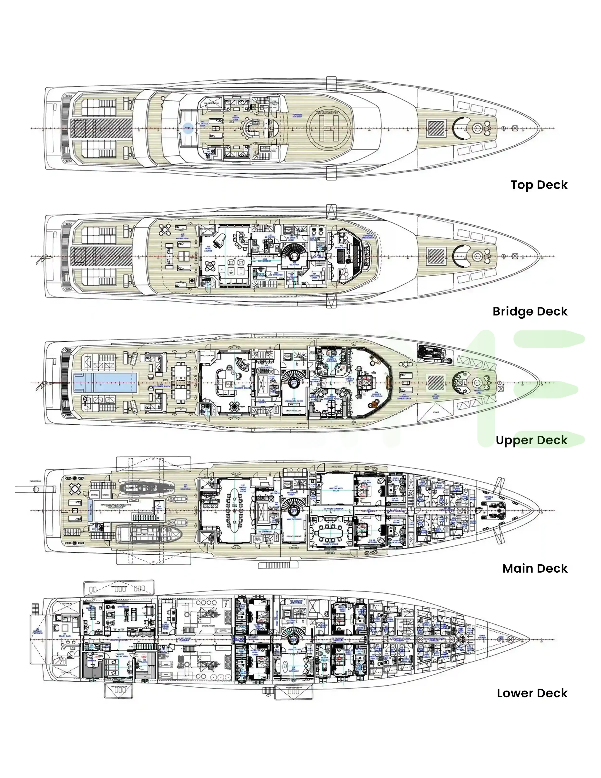 Request plans that include the layout of staterooms, guest areas, and outdoor spaces, as well as crew quarters and work areas.