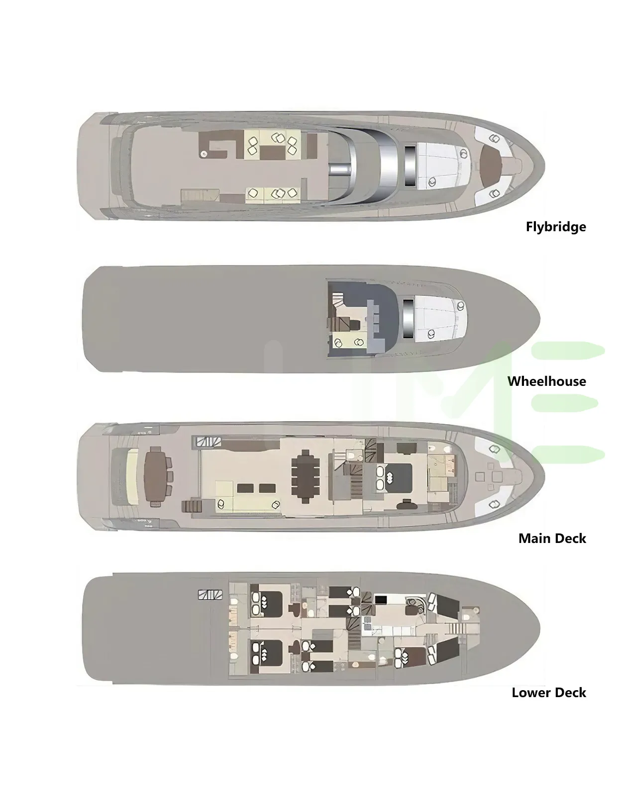 Request plans that include the layout of staterooms, guest areas, and outdoor spaces, as well as crew quarters and work areas.