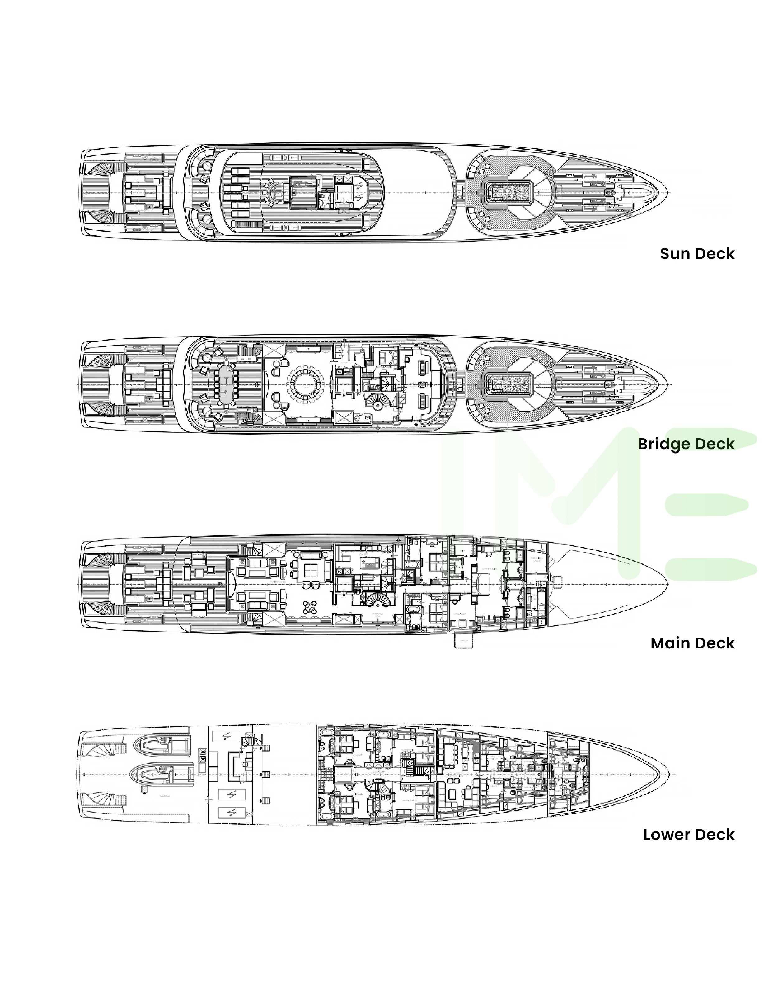 Request plans that include the layout of staterooms, guest areas, and outdoor spaces, as well as crew quarters and work areas.