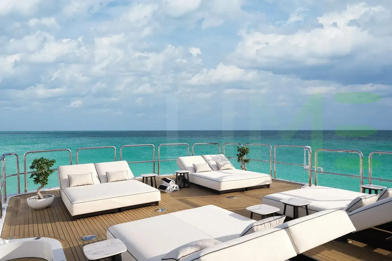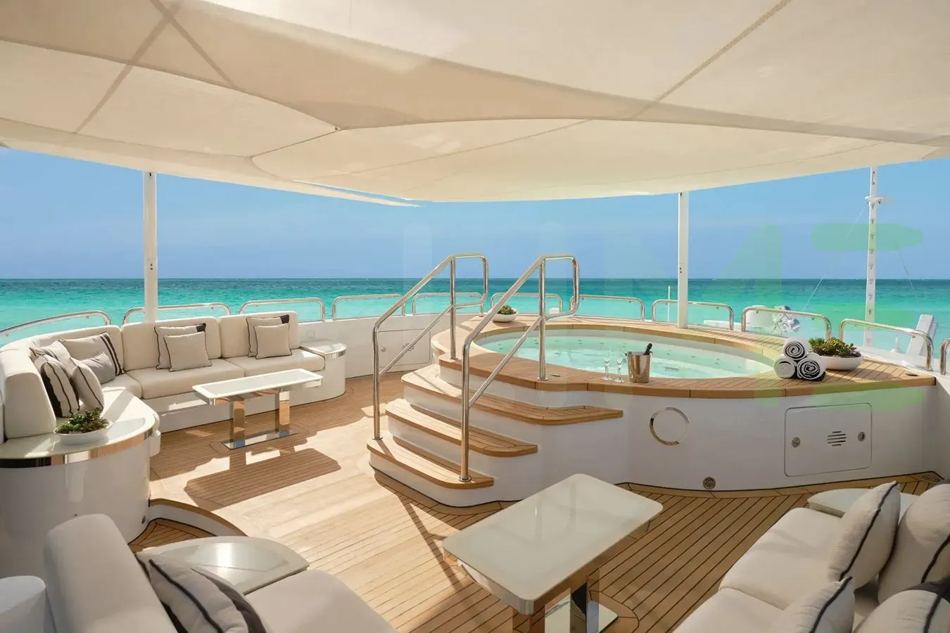On your charter, you'll find plenty to keep you busy and entertained, notably a beach club for you to relax on the edge of the water. You can visit the well-equipped gym so that you can keep up with your fitness routine at sea or elsewhere, sit back with a glass of champagne in the deck jacuzzi.