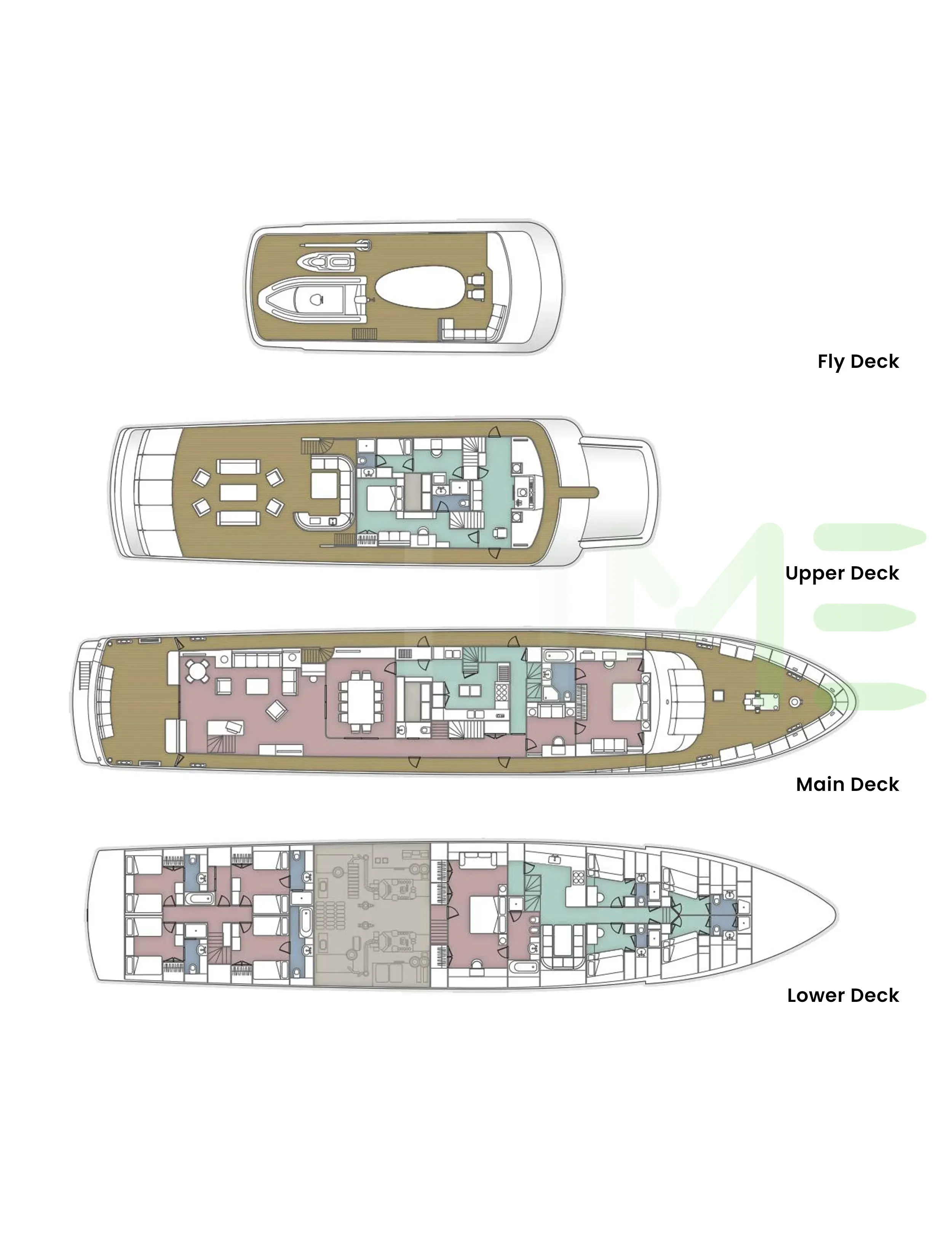 Request plans that include the layout of staterooms, guest areas, and outdoor spaces, as well as crew quarters and work areas.