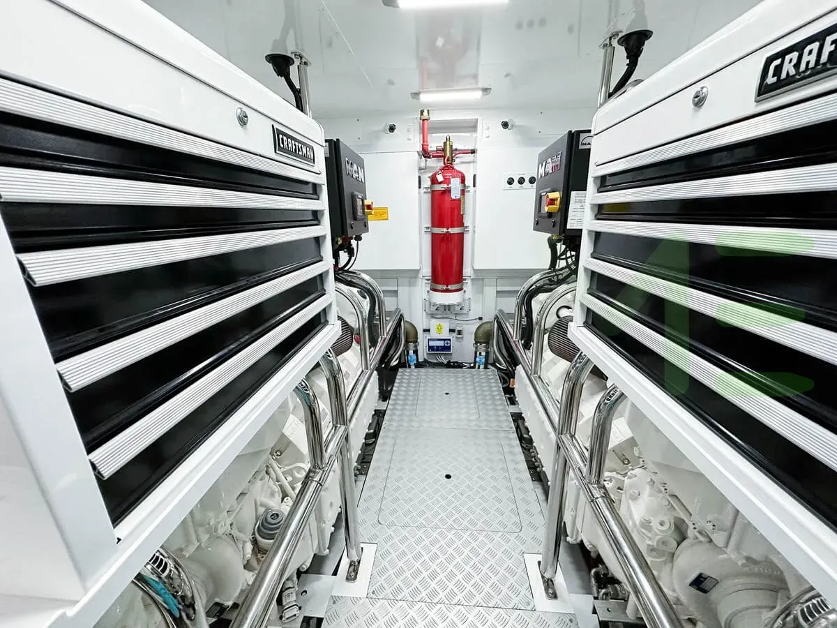 Powered by two MAN main engines, each generating 1,417 horsepower, for a total combined output of 2,834 horsepower. Notably, the HANG LOOSE yacht is one of 1,055 yachts greater than 65’(19m) with MAN engines.