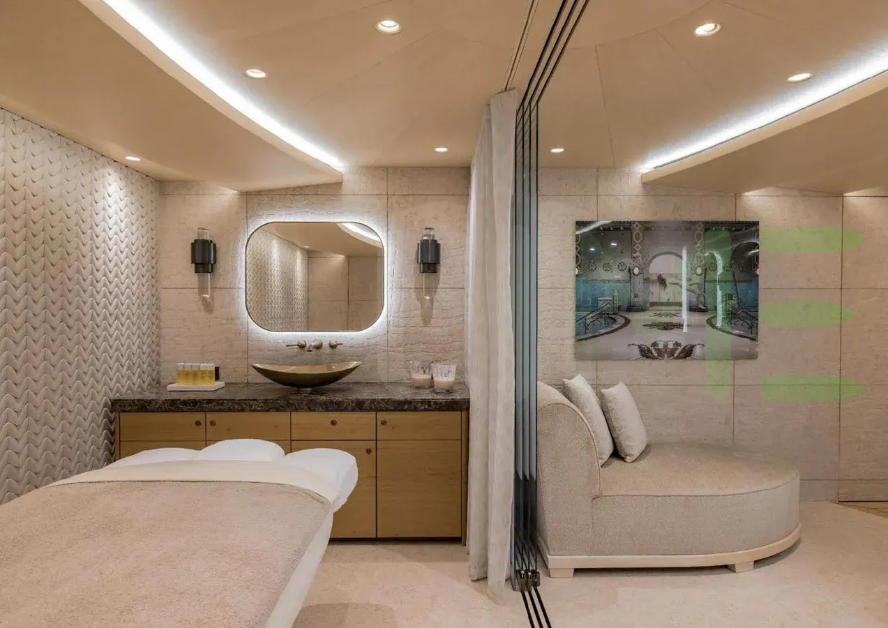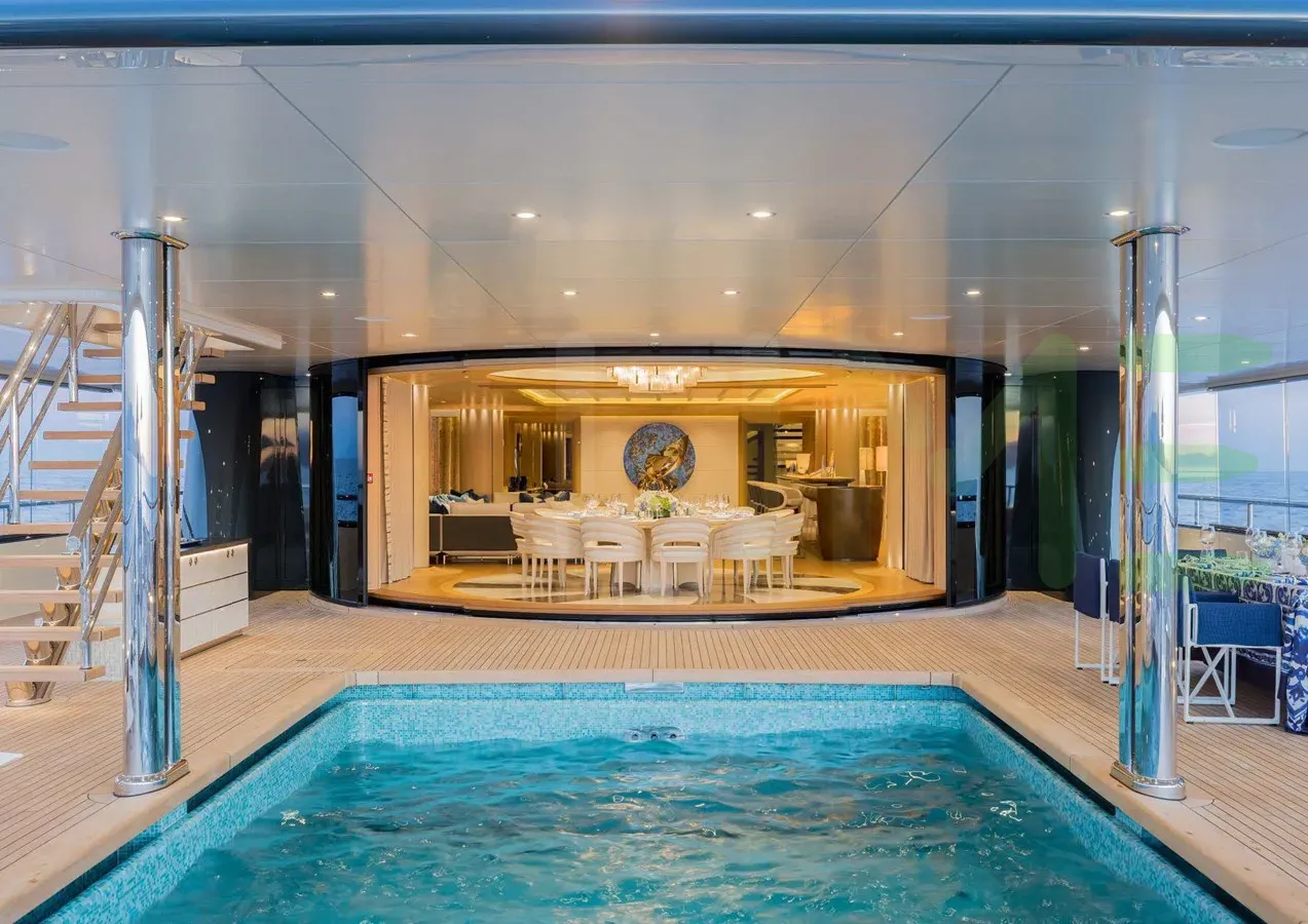 Her features include piano, spa, beauty salon, satellite communications, underwater lights, beach club, gym, deck jacuzzi, WiFi and air conditioning.