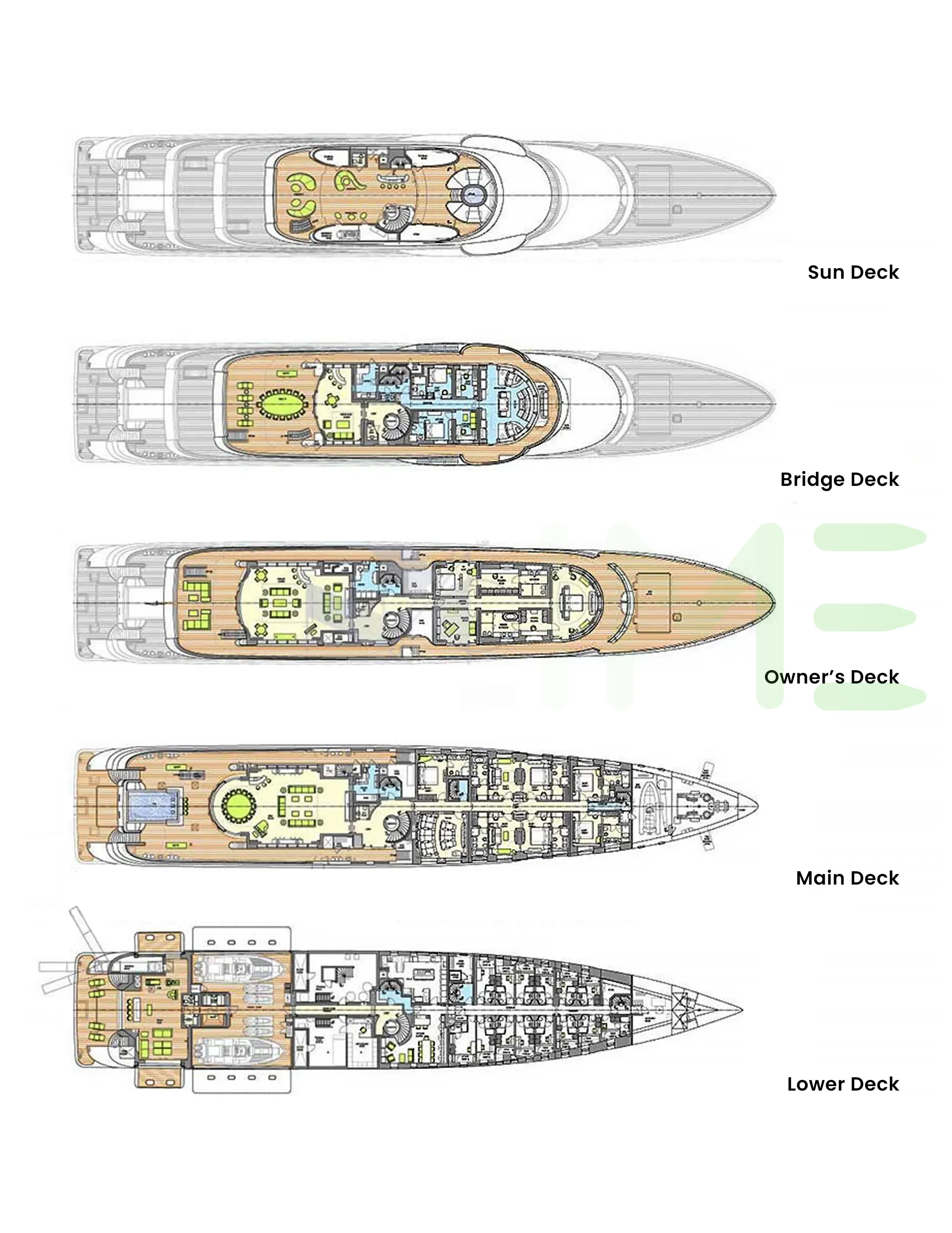 Request plans that include the layout of staterooms, guest areas, and outdoor spaces, as well as crew quarters and work areas.